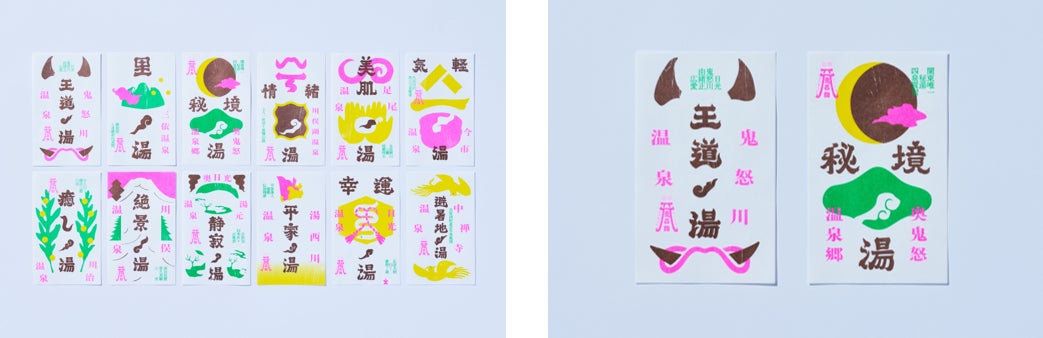 日光の各温泉地をモチーフに、色鮮やかなデザインであしらわれた御ゆ印札。