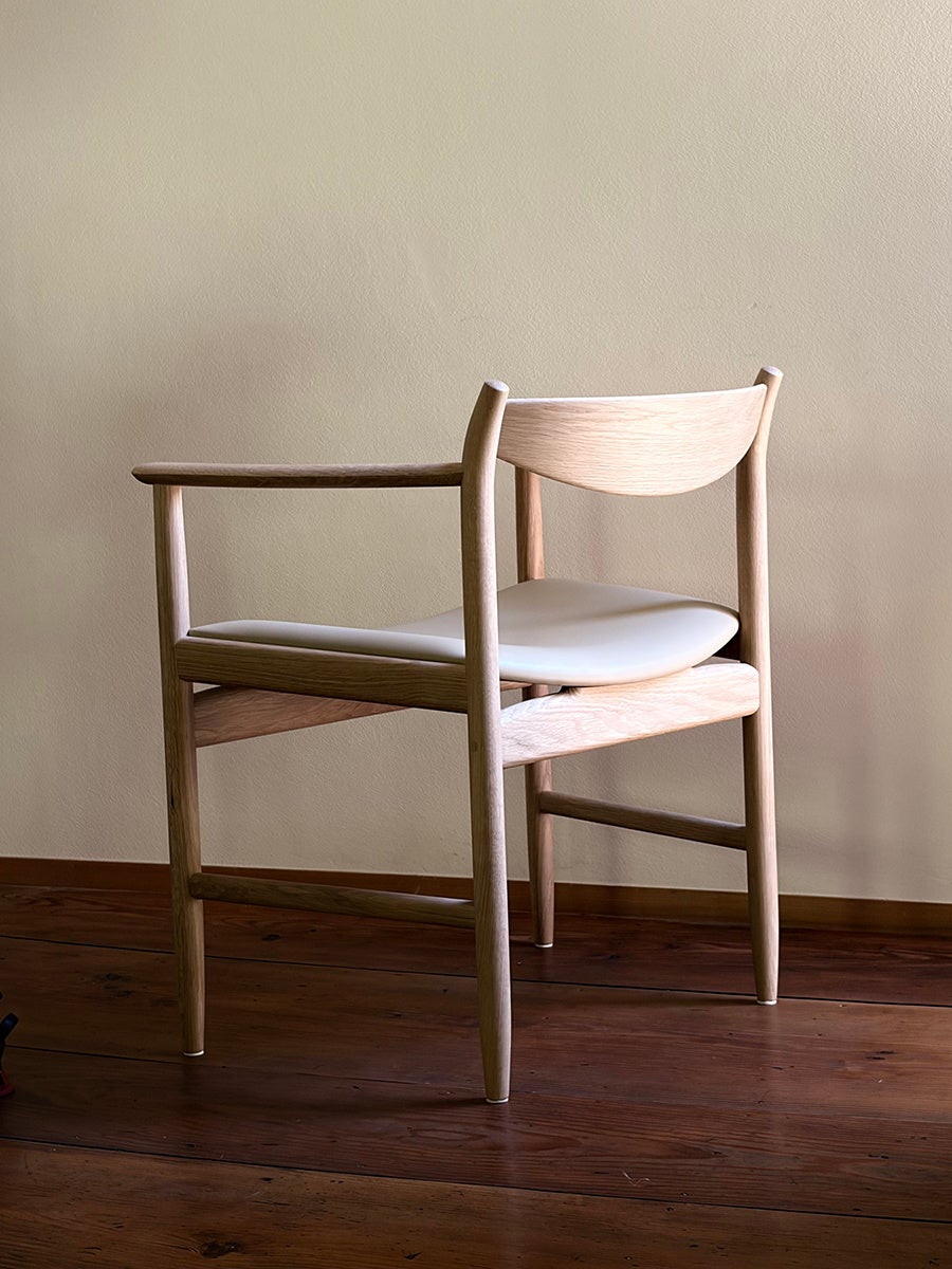 木の椅子は、日々の食卓で使うためのアームチェアで、座面を張り地とし、長く座っても疲れない、生活のための椅子を目指したプロダクトです。