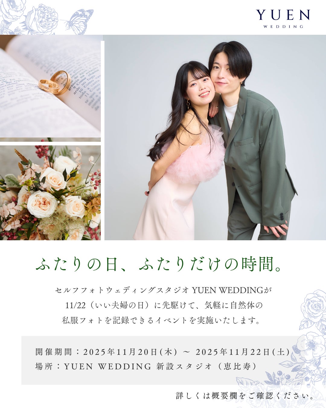 セルフフォトウェディングスタジオ「YUEN WEDDING」(運営:合同会社yuen)は、2025年11月20日(木)から11月22日(土)までの3日間、新設スタジオ(恵比寿)にて、いい夫婦の日を記念した無料フォトイベント『ふたりの日、ふたりだけの時間。』を開催いたします。