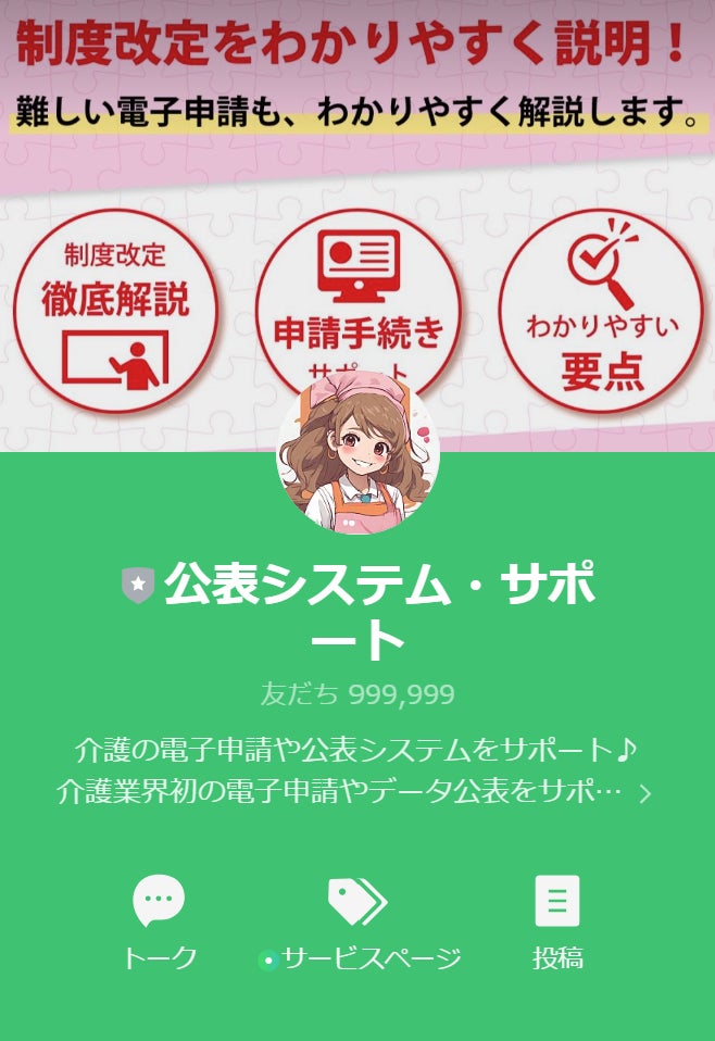 このアカウントでは、ポータルサイト「公表システム・サポート(https://www.kaigokensaku.net/)」と同様に、介護保険制度の改正に合わせて、本格スタートする電子申請の制度や手続きなど、介護事業所さんの目線で分かりやすく情報提供していきます。