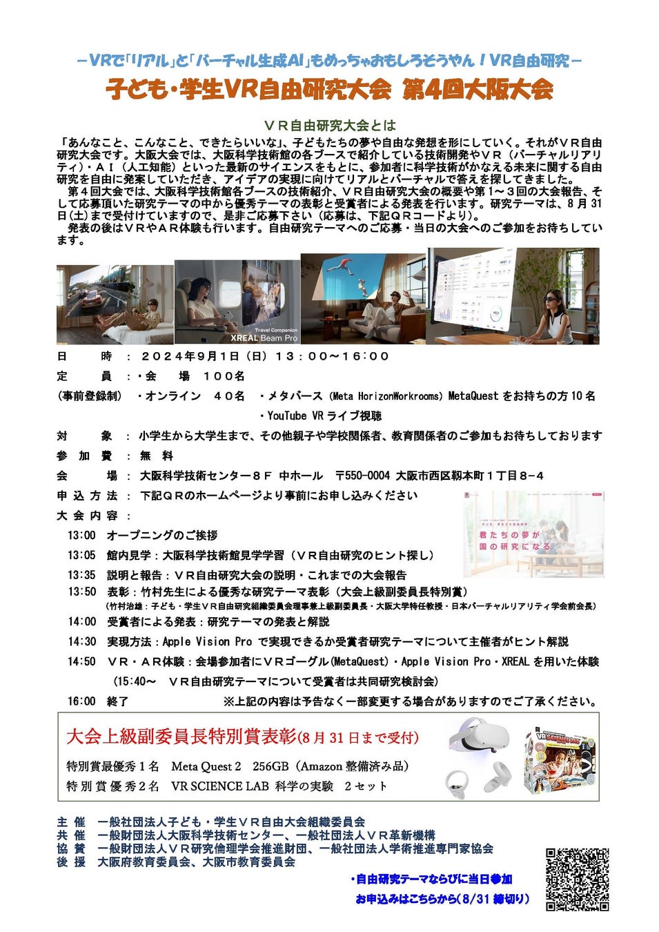 目的:子ども・学生VR自由研究大会の開催を通じて、日本の将来を担う科学者を育成し、学術及び科学技術の振興と児童及び青少年の健全な育成に寄与すること