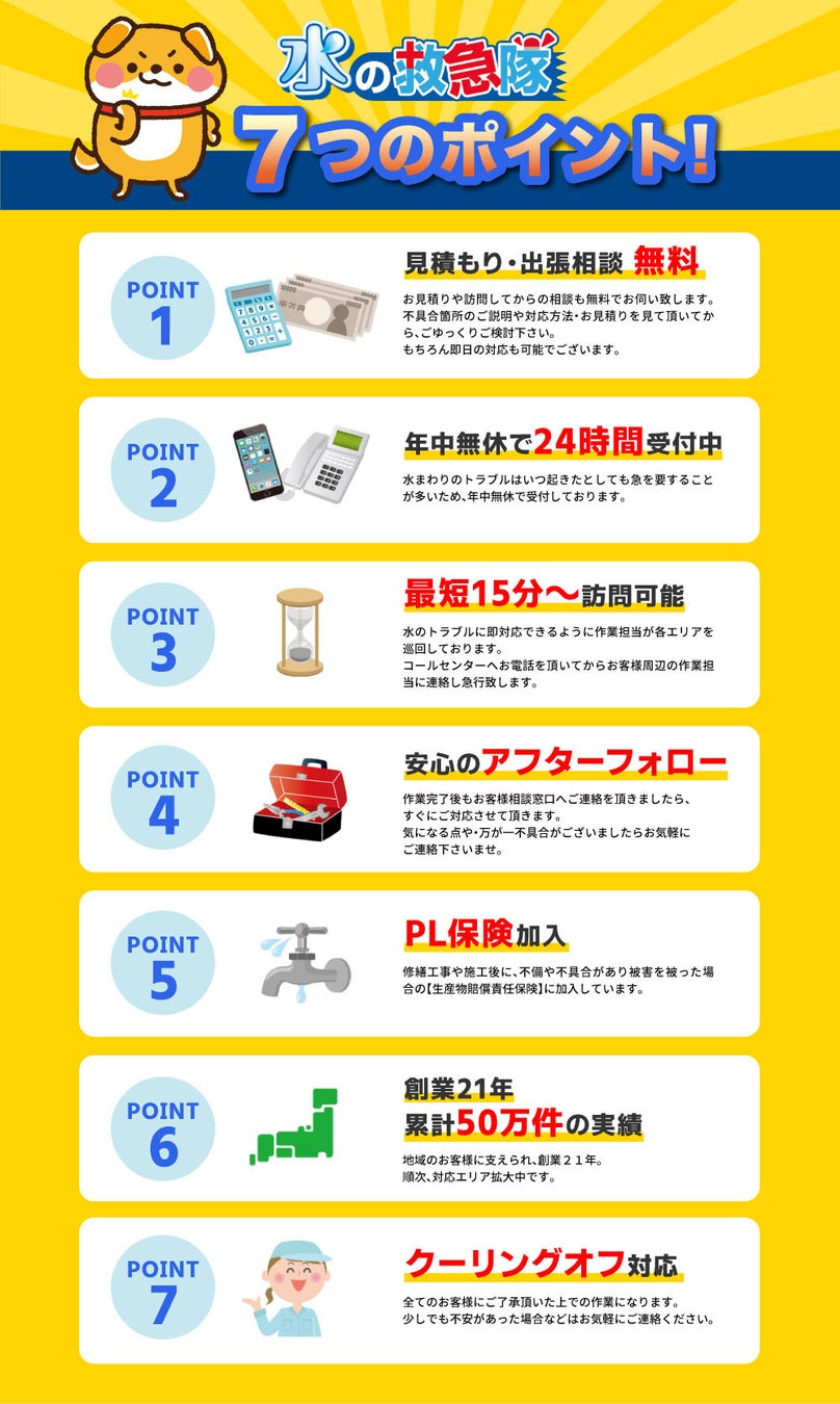 水の救急隊では、少しでもお客様に安心して頂けるように「見積無料」「訪問・出張費無料」「作業前見積」の水のトラブル駆付けサービスを提供させて頂いています。