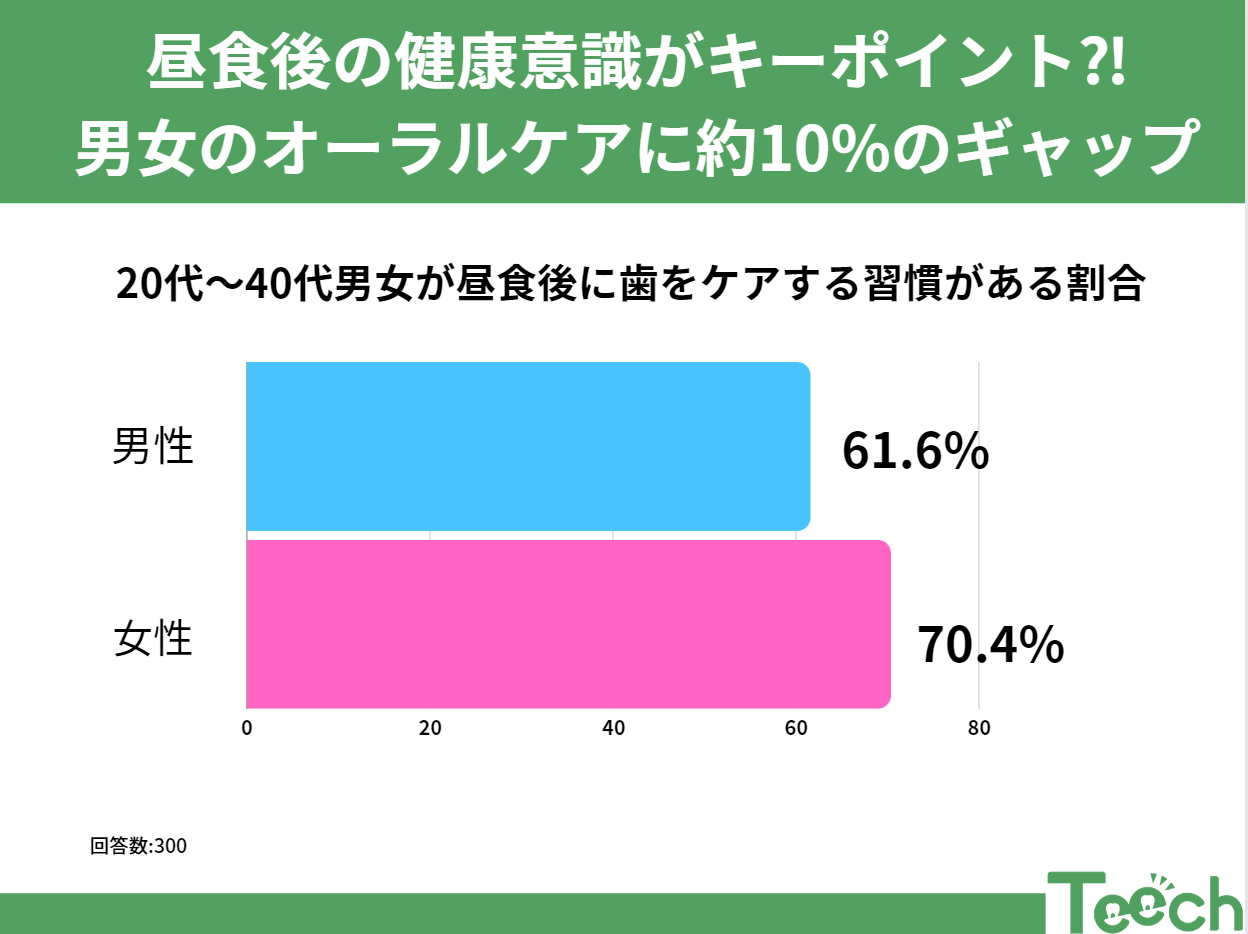 この調査によれば、昼食後にオーラルケア製品を利用している男性は61.6%に留まるのに対し、女性はそれを上回る70.4%という結果が出ました。約10ポイントの差は、健康に対する日常的な注意深さと予防的措置への意識が、男女で異なることを示しています。