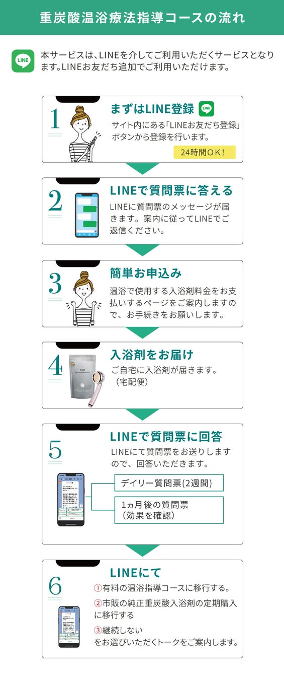 長湯式重炭酸温浴療法オンラインクリニックでは、まずLINE友達登録していただき、質問票への回答~1か月間の重炭酸温浴療法指導コース無料体験申込~純正重炭酸入浴剤が自動で届く仕組みとなっています。