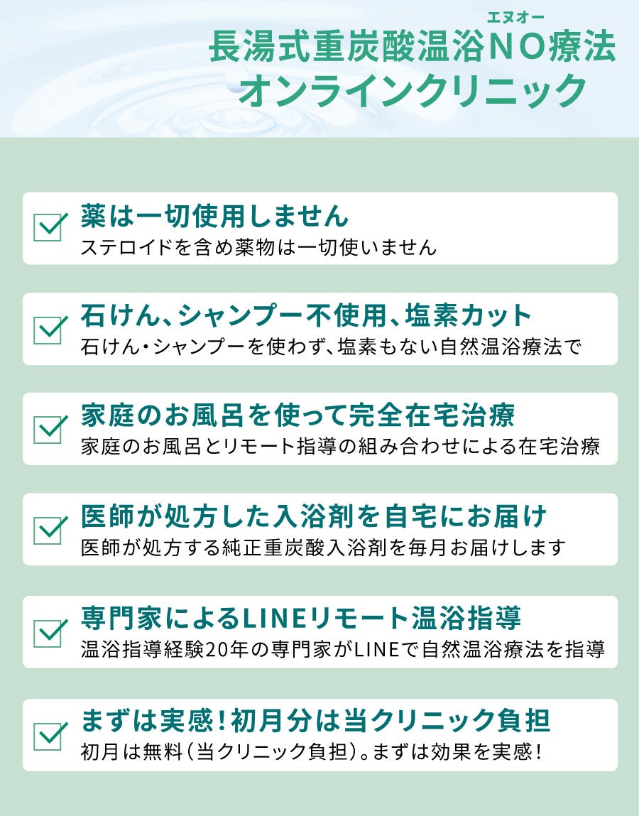 【初月無料体験モニター募集!】アトピー性皮膚炎の治療に朗報!薬に頼らない『長湯式重炭酸温浴NO療法(石鹸やシャンプーを使わず塩素もカット)』家庭のお風呂で湯治を在宅リモートで実現。