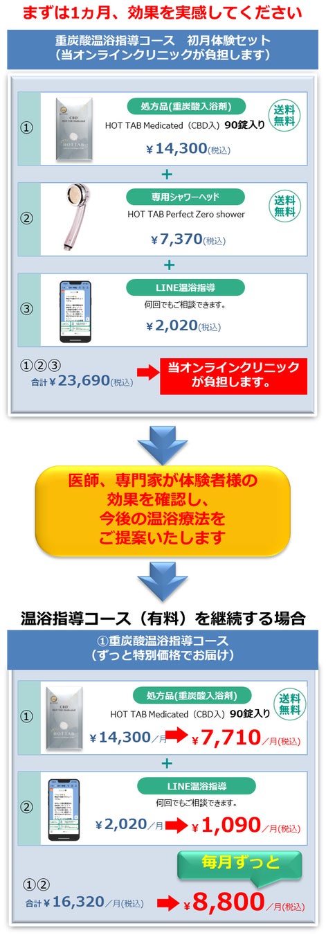 医師の監督の下、専任入浴指導士が症状に応じてオンラインによる温浴療法を指導いたします。まずは1か月間、この長湯式重炭酸温浴NO療法を体験いただいた後に、医師がその効果を確認した上で、温浴指導コース(有料)に移行するなどの、患者様に合った温浴療法を決めていきます。