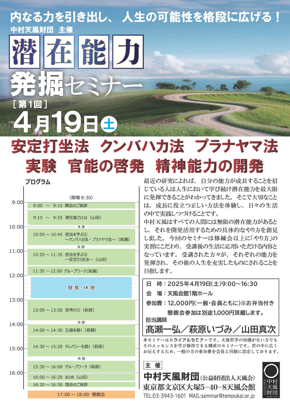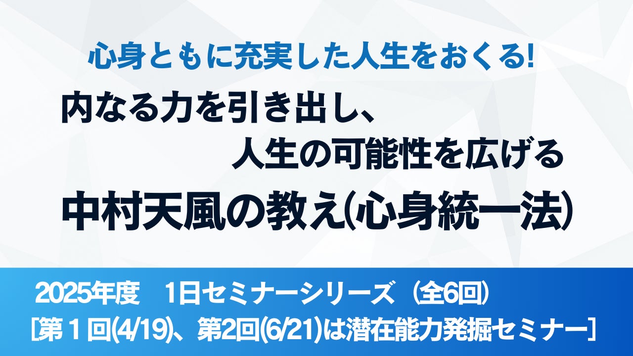公益財団法人天風会(所在地:東京都文京区/理事長:山田真次/通称名:中村天風財団/以下、当会)は、2025年4月19日(土)・6月21日(土)・10月11日(土)・2026年1月17日(土)・2月14日(土)・3月7日(土)の全6回で、潜在能力の引き出し方を身につけるための「1日セミナーシリーズ」を開催いたします。参加費は12,000~30,000円/回です。