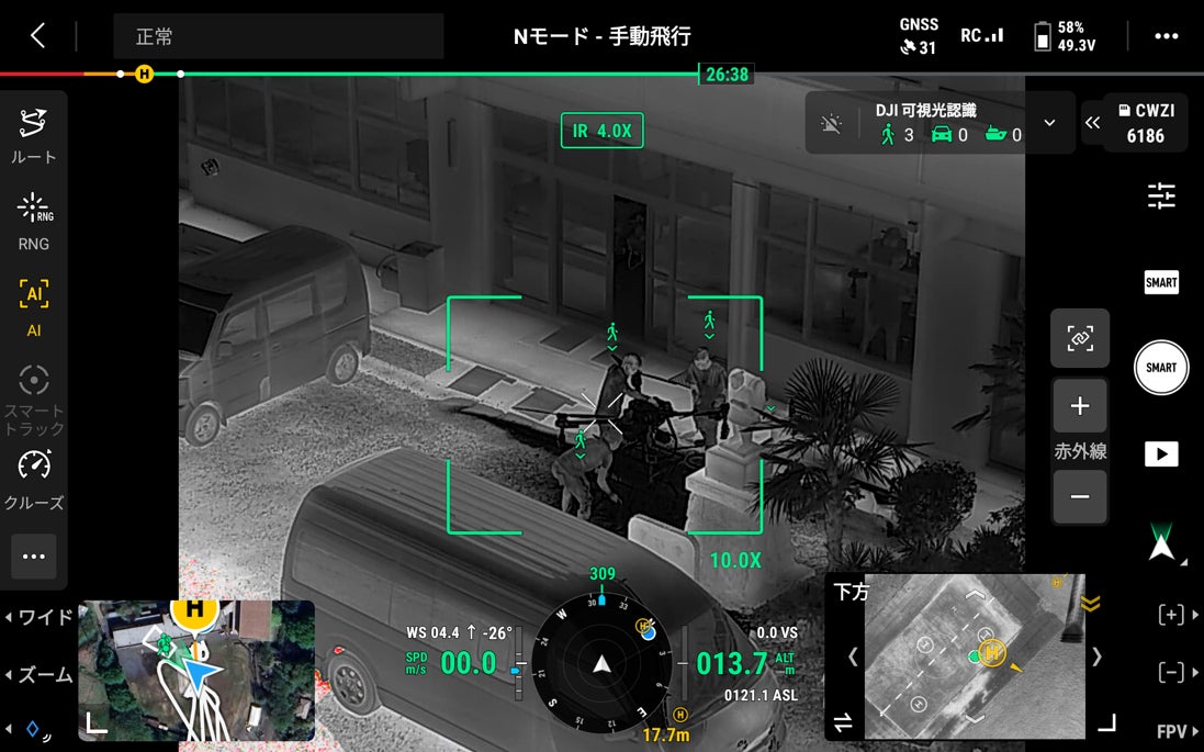 検知はドローン本体側(オンボード処理)で行われるため、外部リソースに頼る必要はありません。そのため、送信機をメインとした純正アプリケーションDJI Pilot2、クラウドベースでドローンを操縦・管理するDJI FlightHub2上でシームレスに動作します。