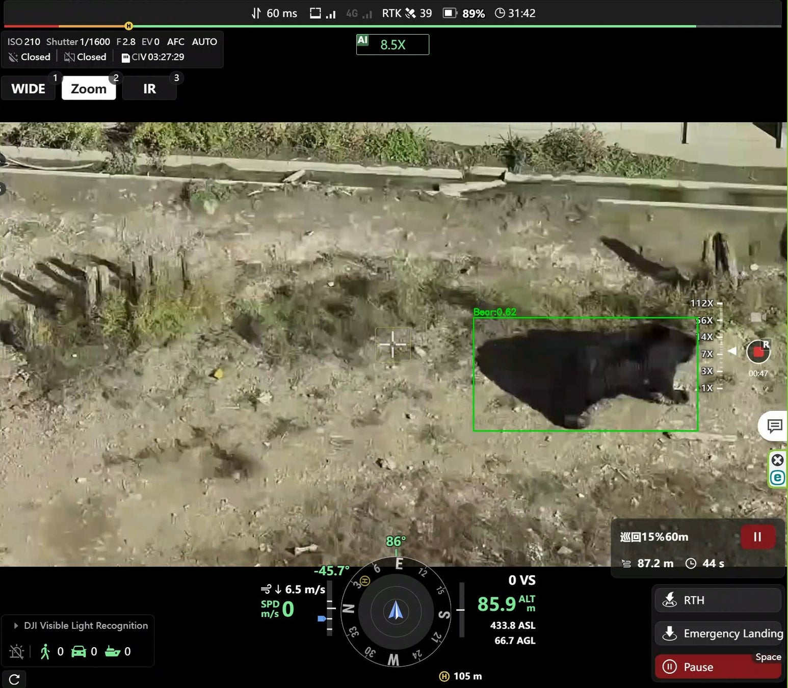 機体に標準で搭載されている検知可能な物は現時点で「人・車・船舶」です。検知はドローンのワイド・ズーム・赤外線カメラで検知が可能です。※本クマAI検知は現在赤外線カメラ未対応です。
