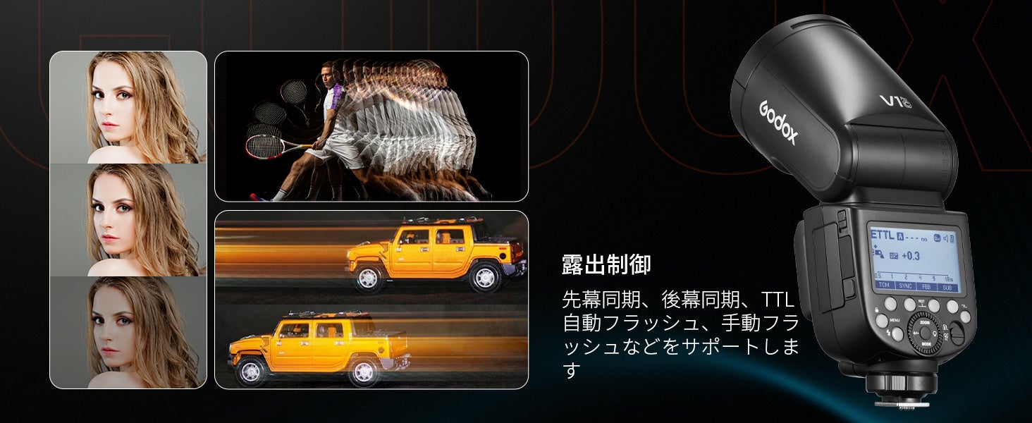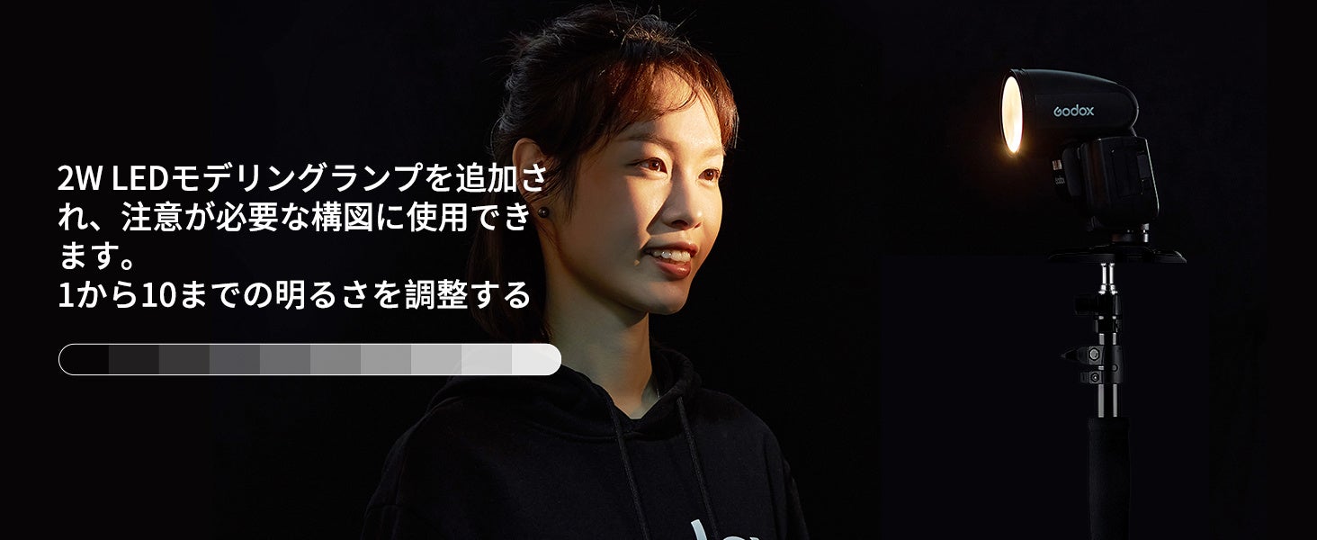 V1Proは、最大1/8000秒の高速同期をサポートし、明るい背景を管理し、広い開口部での撮影に加え、フロント/リアカーテンシンクとフラッシュ露光補正をサポートします。これらの特徴に加えて、2W LEDモデリングランプを追加され、注意が必要な構図に使用できます。