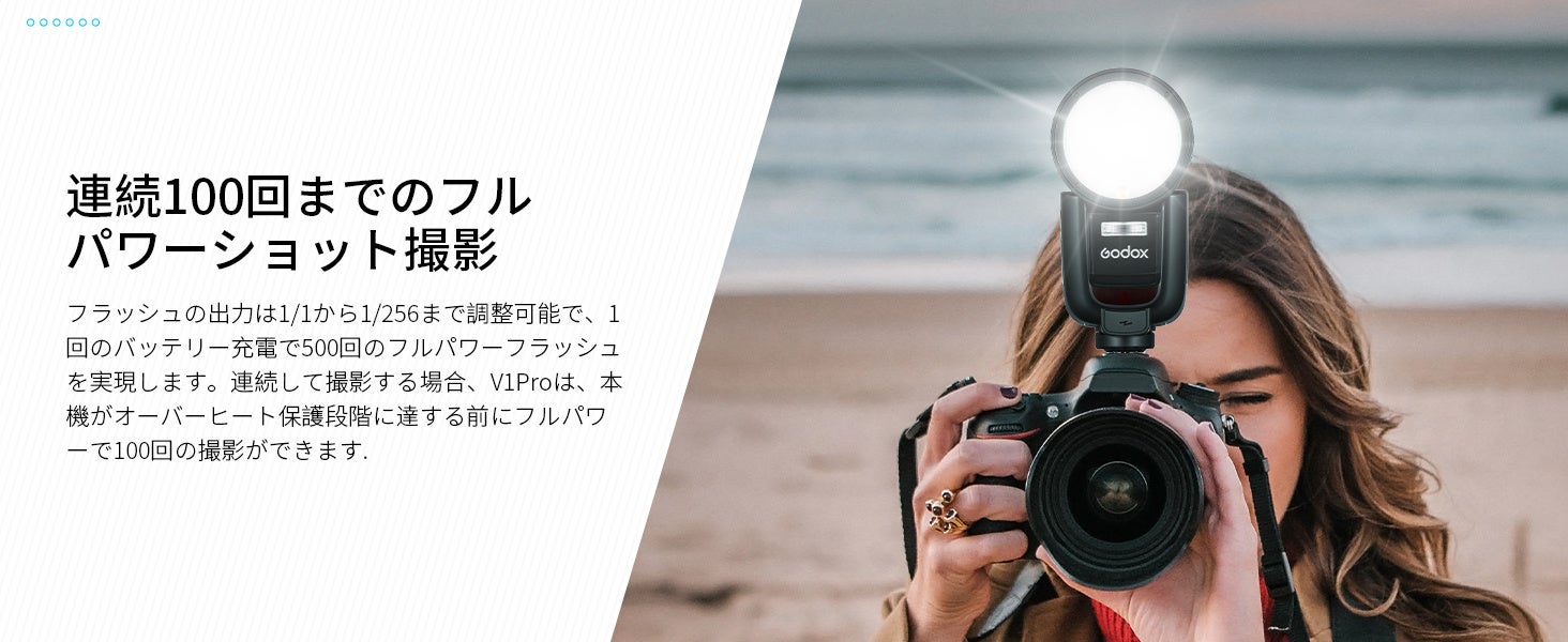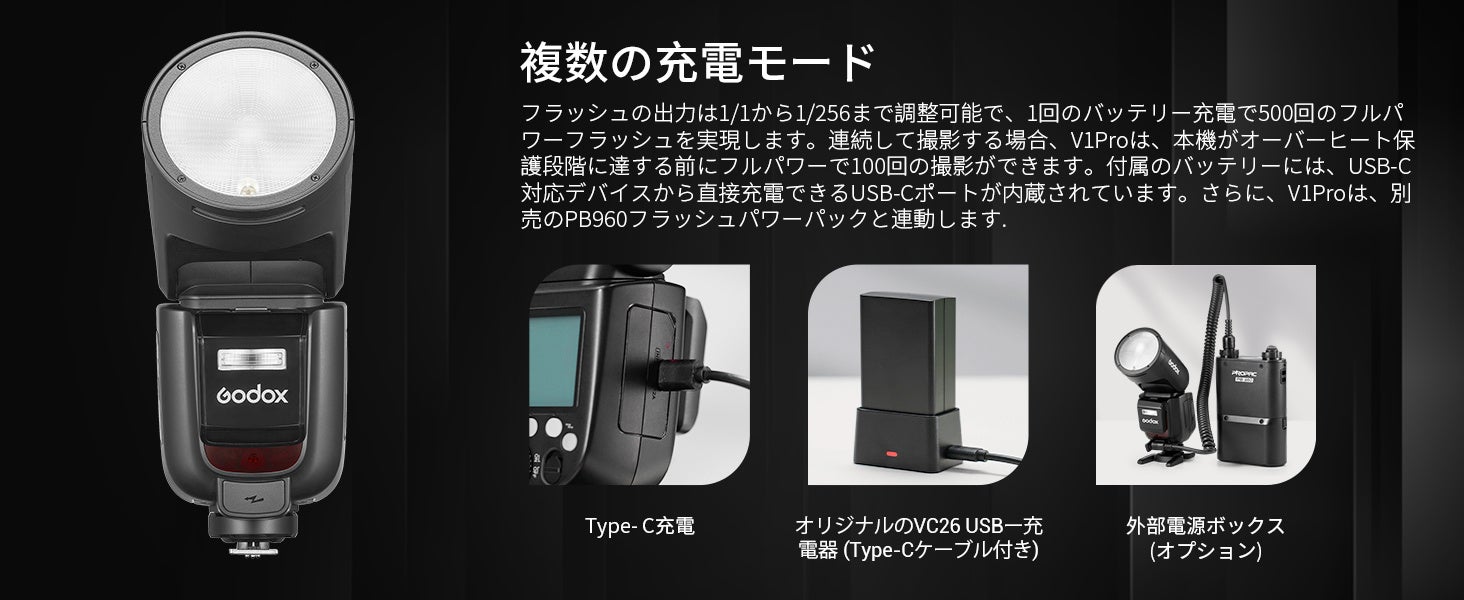 本機は付属の充電式バッテリーで駆動し、リサイクルタイムは1.5秒と、アクションについていくのに十分な速さです。フラッシュの出力は1/1から1/256まで調整可能で、1回のバッテリー充電で500回のフルパワーフラッシュを実現します。連続して撮影する場合、V1Pro Fは、本機がオーバーヒート保護段階に達する前にフルパワーで100回の撮影ができます。付属のバッテリーには、USB-C対応デバイスから直接充電できるUSB-Cポートが内蔵されています。さらに、V1Proは、別売のPB960フラッシュパワーパックと連動します。