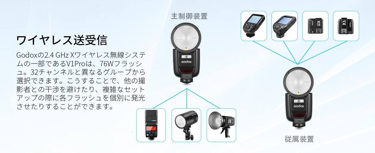 Godoxの2.4 GHz Xワイヤレス無線システムの一部であるV1Proは、76Wフラッシュ。32チャンネルと異なるグループから選択できます。こうすることで、他の撮影者との干渉を避けたり、複雑なセットアップの際に各フラッシュを個別に発光させたりすることができます。