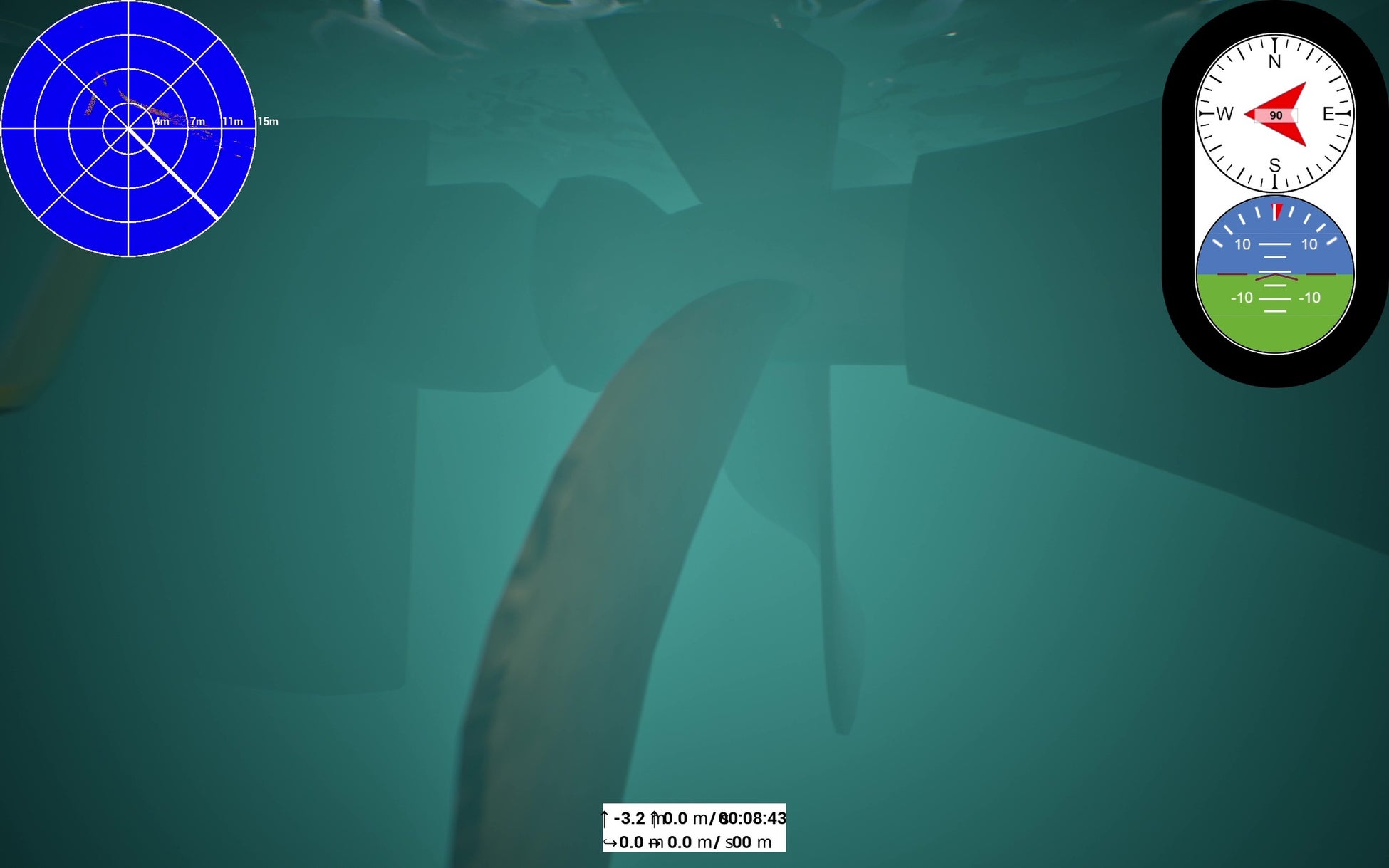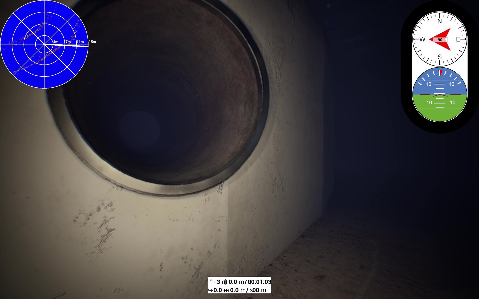 FF Virtualは自社が開発販売する水中ドローンFF1/FF2の挙動をシミュレートしています。訓練フィールドとして大型船舶の船底、地下水槽や管路といったインフラ維持管理施設をシミュレーションフィールドとして用意し、濁水環境や音響ソナー、テザーケーブルなど余すことなく再現しています。
