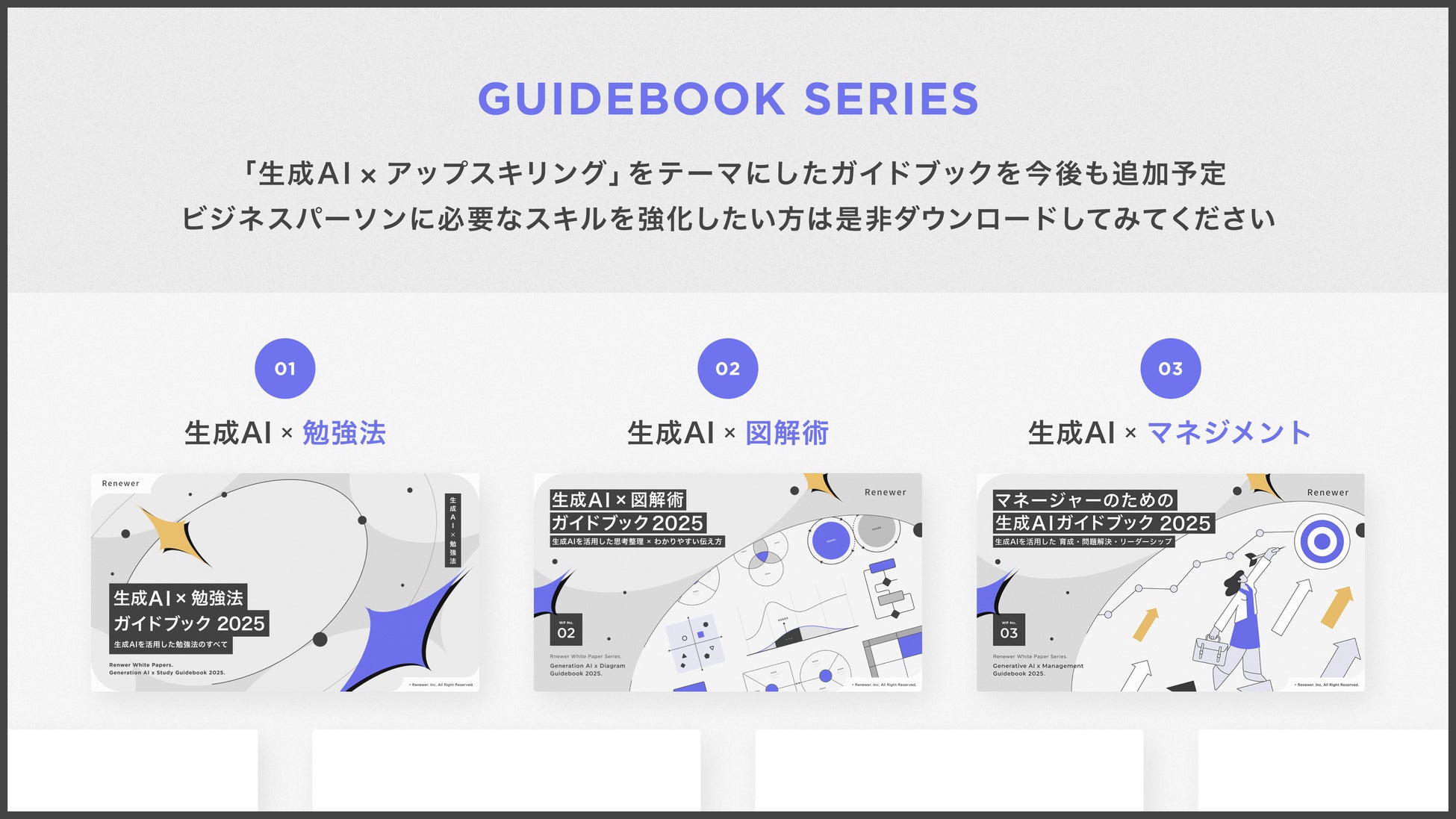 Renewerでは、「生成AI × アップスキリング」シリーズを通じて、生成AIを使って「人の力を高める方法」をわかりやすく紹介しています。その第3弾として、『生成AI × マネージャーガイドブック 2025』を公開しました。このガイドブックは、マネージャーやリーダーとして働く方のスキルアップをサポートし、マネジメント業務の負担を軽減することを目的としています。新年度からマネージャーやリーダーとしての役割を担うビジネスパーソンの、準備やスキルアップのためのガイドとしてもおすすめです。