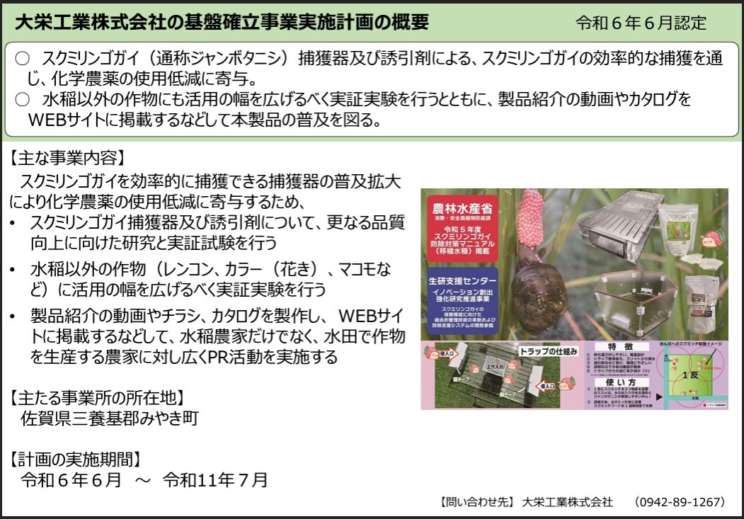 お客様の満足と地域貢献を両立。環境に配慮した製品づくりにも注力し、無農薬・有機農家様に貢献。今回注目の3つをご紹介します。地元佐賀県では初めてのジャンボタニシ注意報を発表しています。