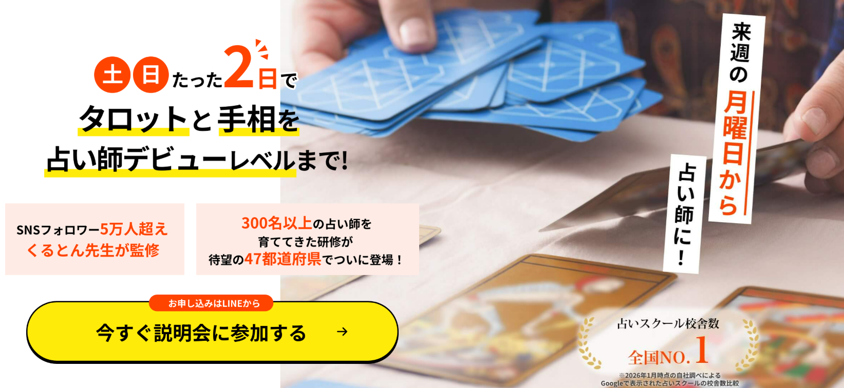 占いに特化したマーケティング会社、株式会社レイジーデイが運営する「占い師養成CAMP」は全国47都道府県でタロット&手相を2日間で学ぶ、短期集中占い師養成講座です。2025年1月に開始してから延べ100件以上のお申し込みがあり、人気占い講座へと急成長中です。