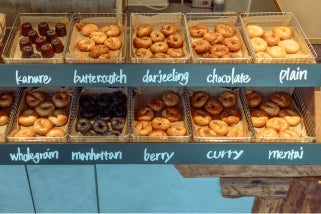 ほんのりビターなチョコレートや甘酸っぱいベリー、福岡ならではの明太子など、およそ10種類以上のベーグルを無料でお楽しみいただけます。