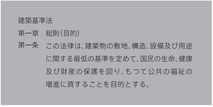 国の建築基準法では、建物は、「国民の生命、健康及び財産の保護を図り、もつて公共の福祉の増進に資することを目的とする。」とあります。