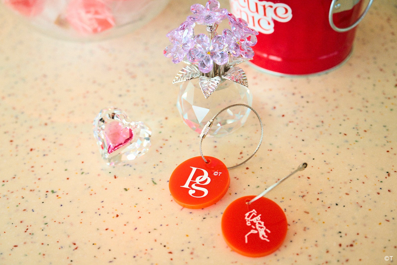 店内に足を踏み入れると床全面に「precure genic」のロゴを施した赤色が広がり、鏡にキービジュアルやロゴが大きく掲出され、一緒に写真を撮ることのできるスポットになっております。店内の随所には、たくさんの『プリキュア』要素が散りばめられており、「キュアブラック」・「キュアホワイト」を思わせる黒と白の花、「なぎさ」が所属するラクロス部をイメージさせるラケット、科学部の部長である「ほのか」をイメージした試験管やシリンダー型の花瓶、変身シーンをイメージさせるキラキラのオブジェやリボンなどが、店内に所狭しと置かれています。また、『プリキュア』の変身アイテムであるカードコミューンやカードなど、懐かしのおもちゃや書籍もディスプレイされています。キッチン窓では、「メップル」と「ミップル」がアイスづくりを見守っており、たくさんの『プリキュア』要素を見つけて楽しめる、こだわり空間となっております。