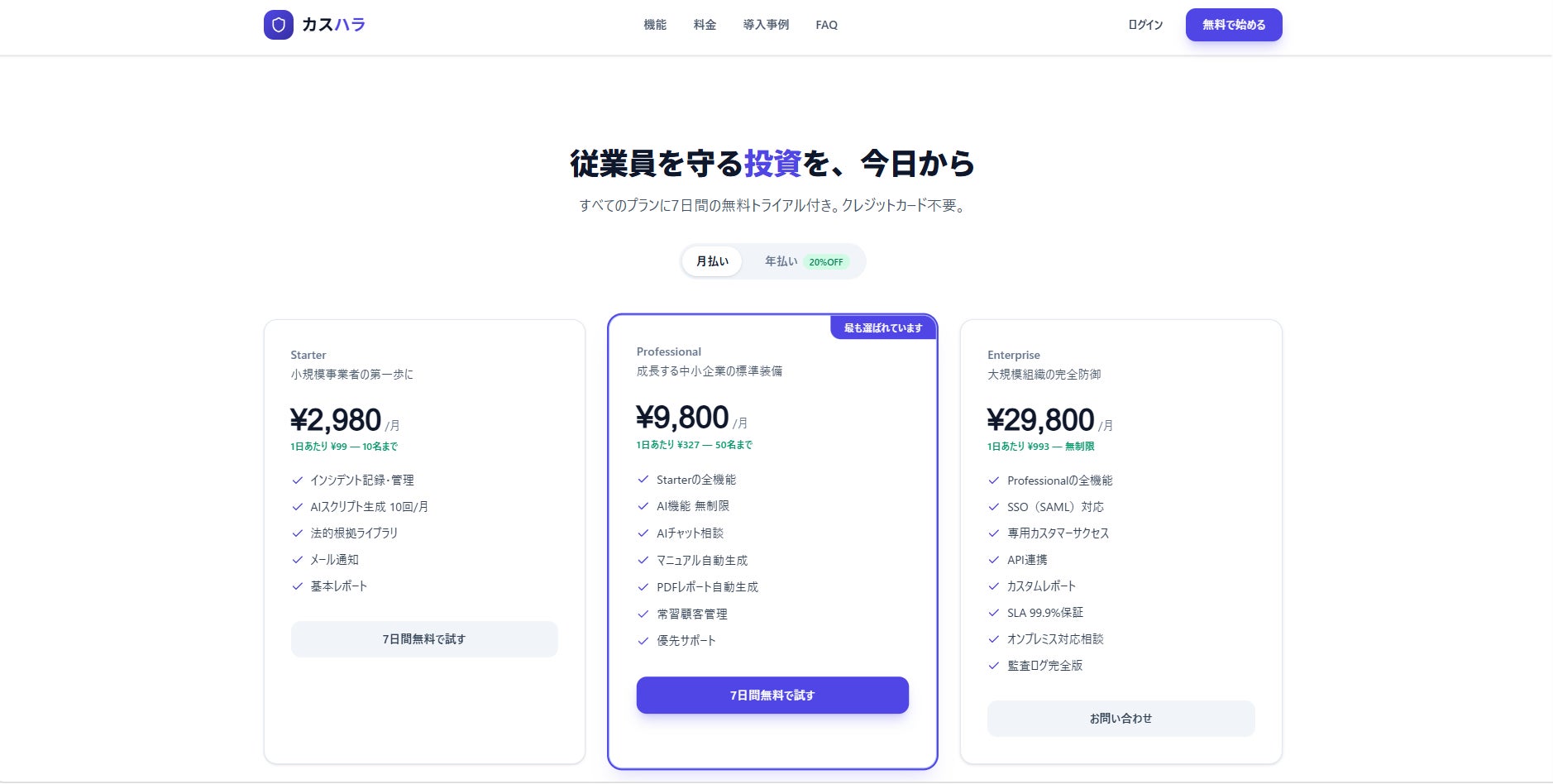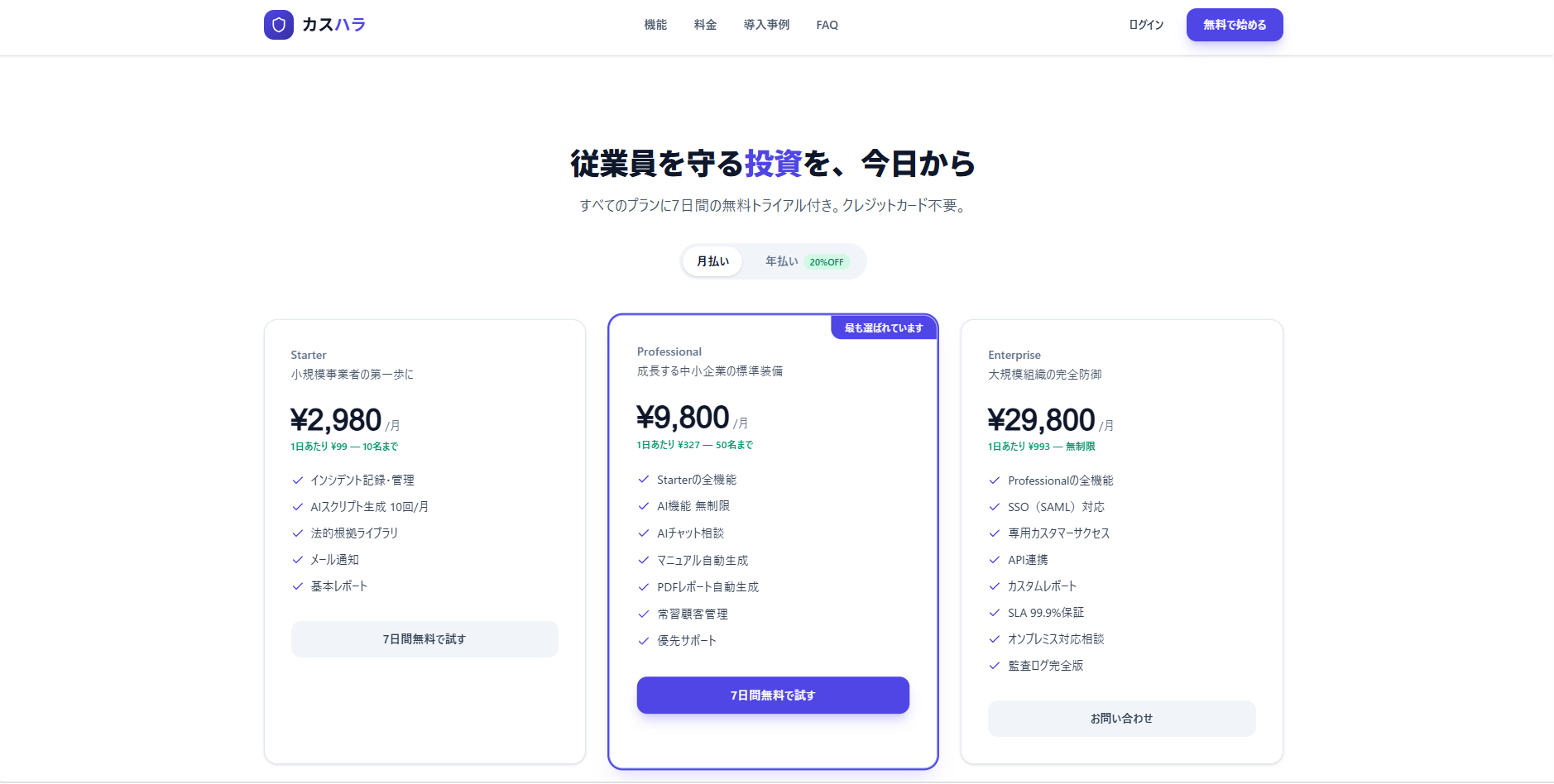 ・プロフェッショナル:月額 9,800円(50名まで・AI相談無制限・研修機能付き)★人気
