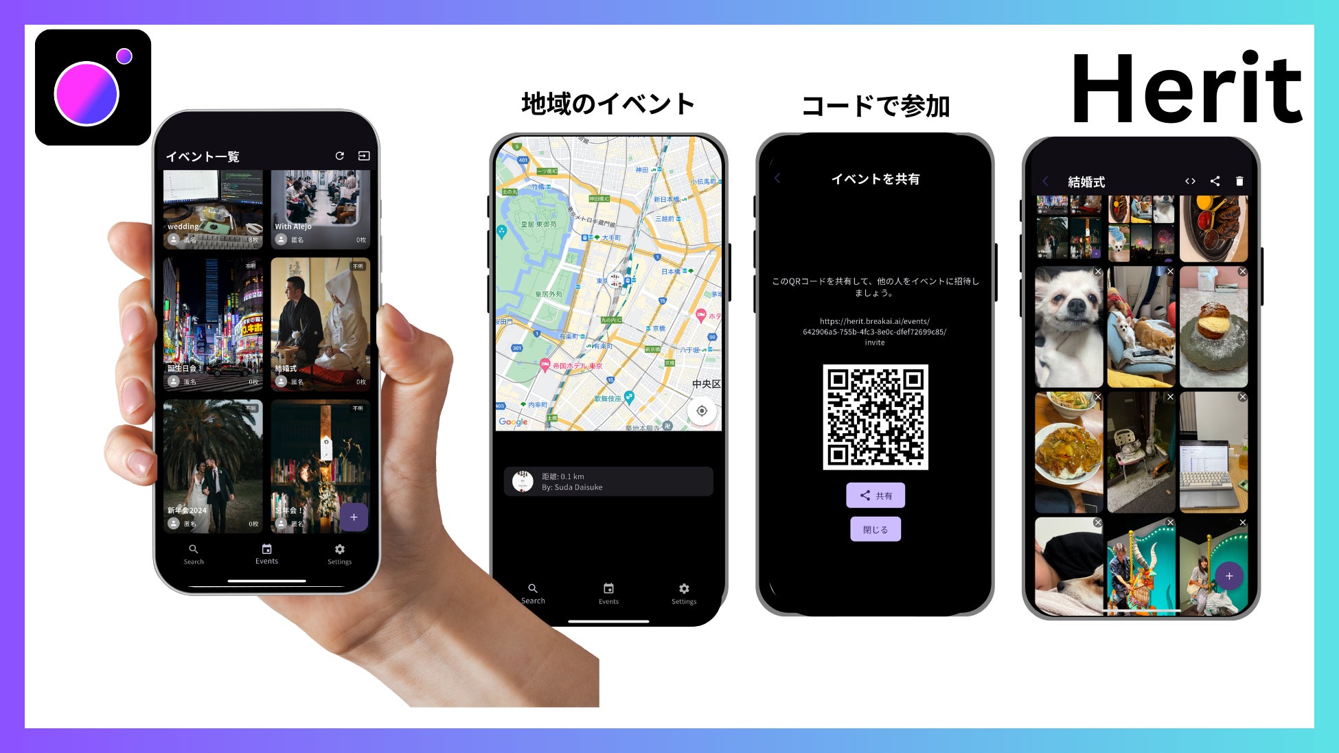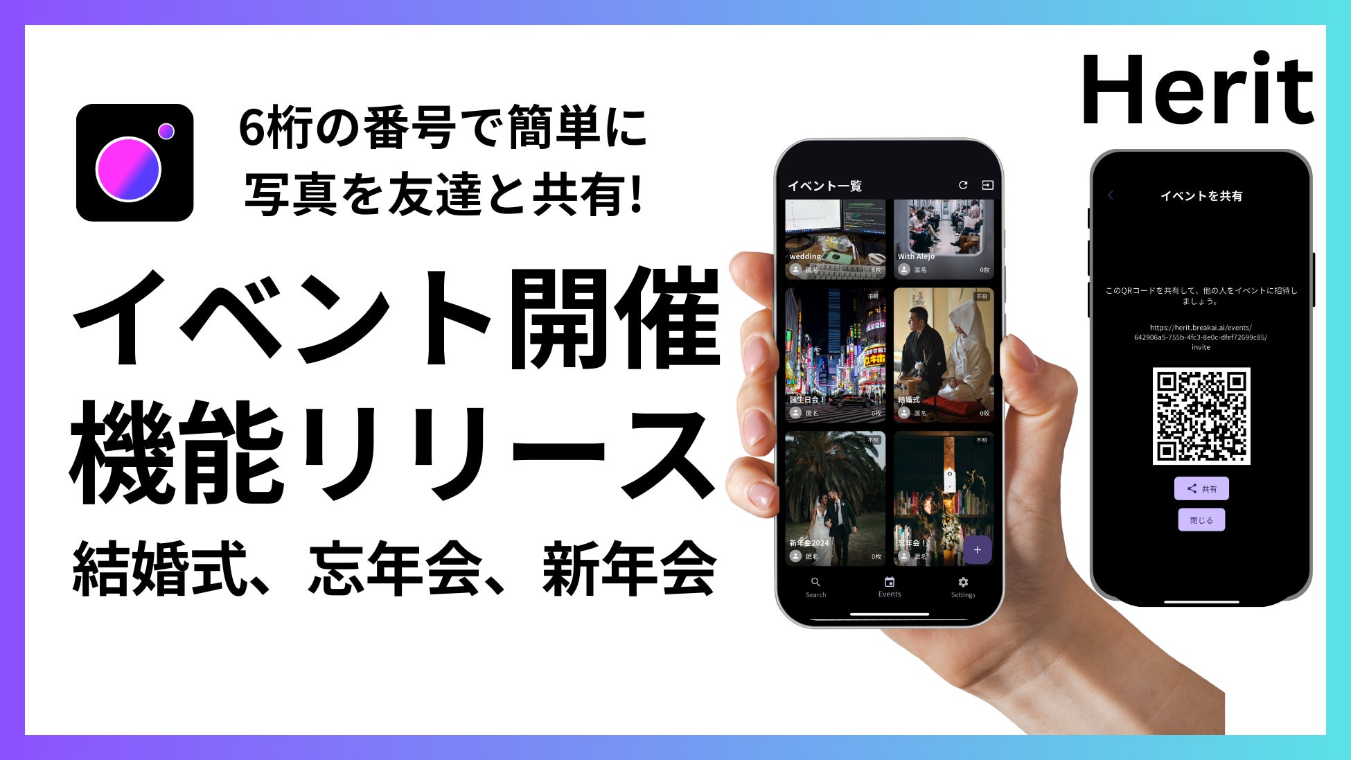 生成AIプロダクトxC向けアプリを開発・運営するBreakAI株式会社 (本社: 東京都千代田区、CEO: 栗山大介、以下「BreakAI」)が提供しているイベントアプリ『Herit』はこのたび、6桁のコードでイベントを簡単に開催でき、プライベートな写真を共有するする機能をリリースしました。結婚式、忘年会・新年会等の本当に親しい人々との大切なイベント写真を記録・共有・主催する機能を提供します。『Herit』を使うことで、イベント・写真共有機能の実装により日々起こる様々なイベントをより手軽により楽しくなります。