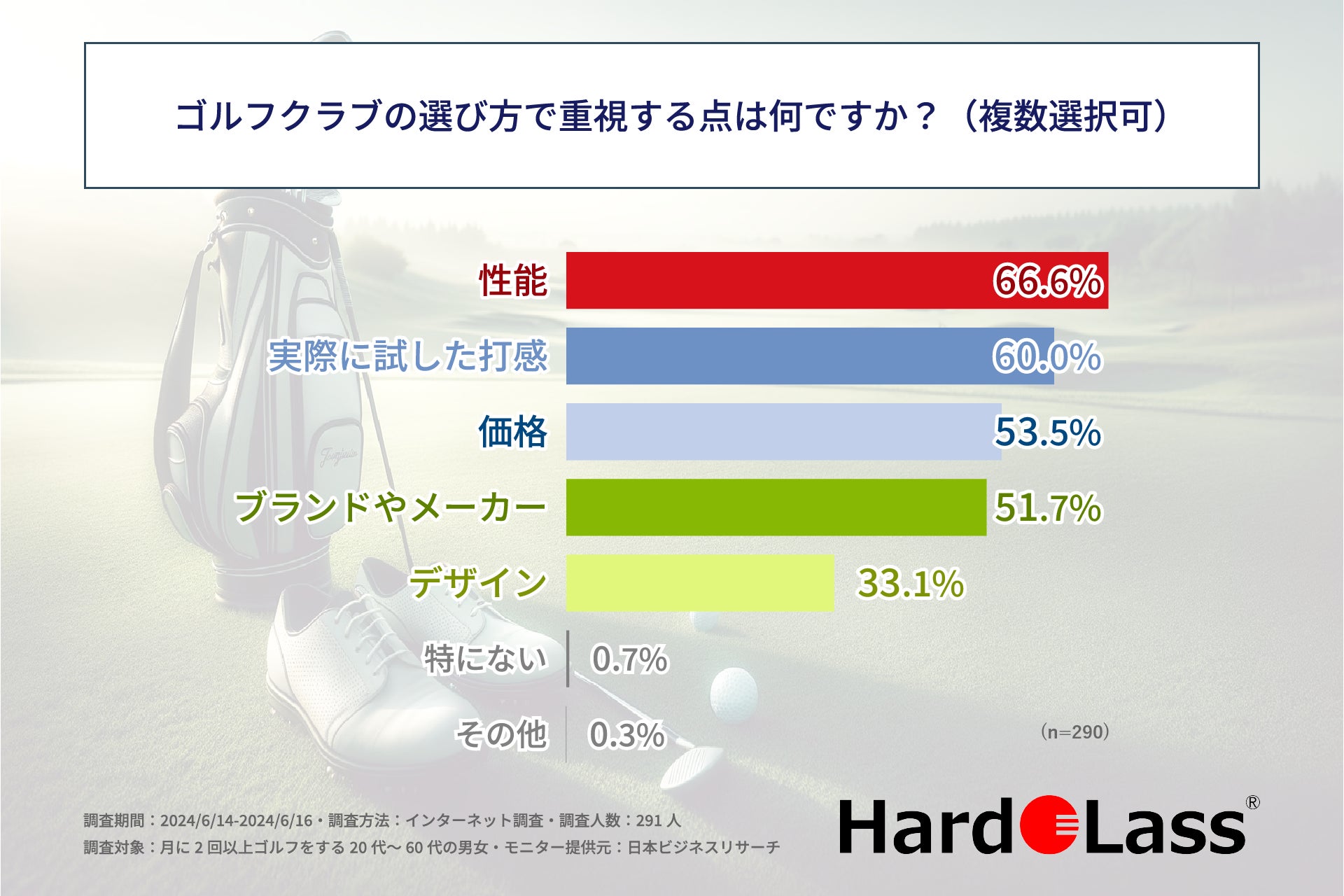 ゴルフクラブ選びで重視する点の1位は「性能」、2位は僅差で「実際に試した打感」