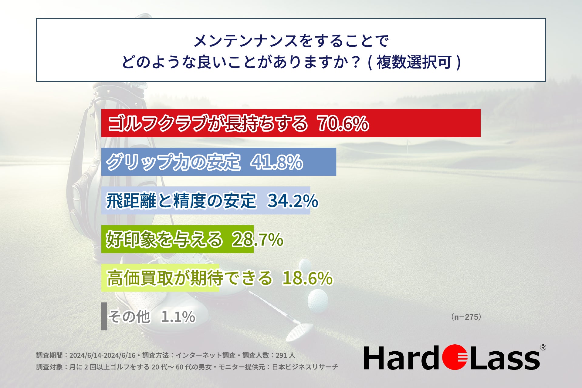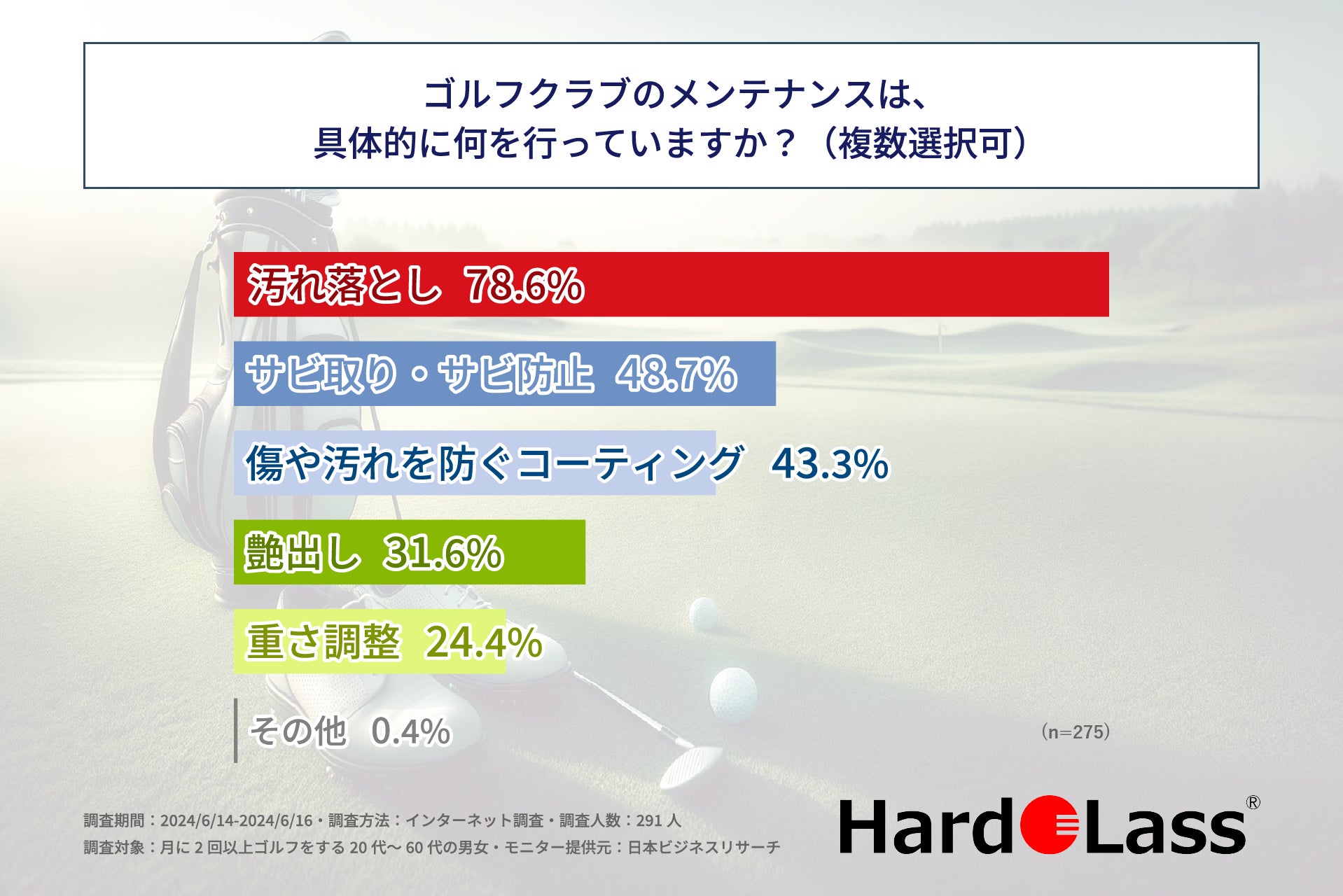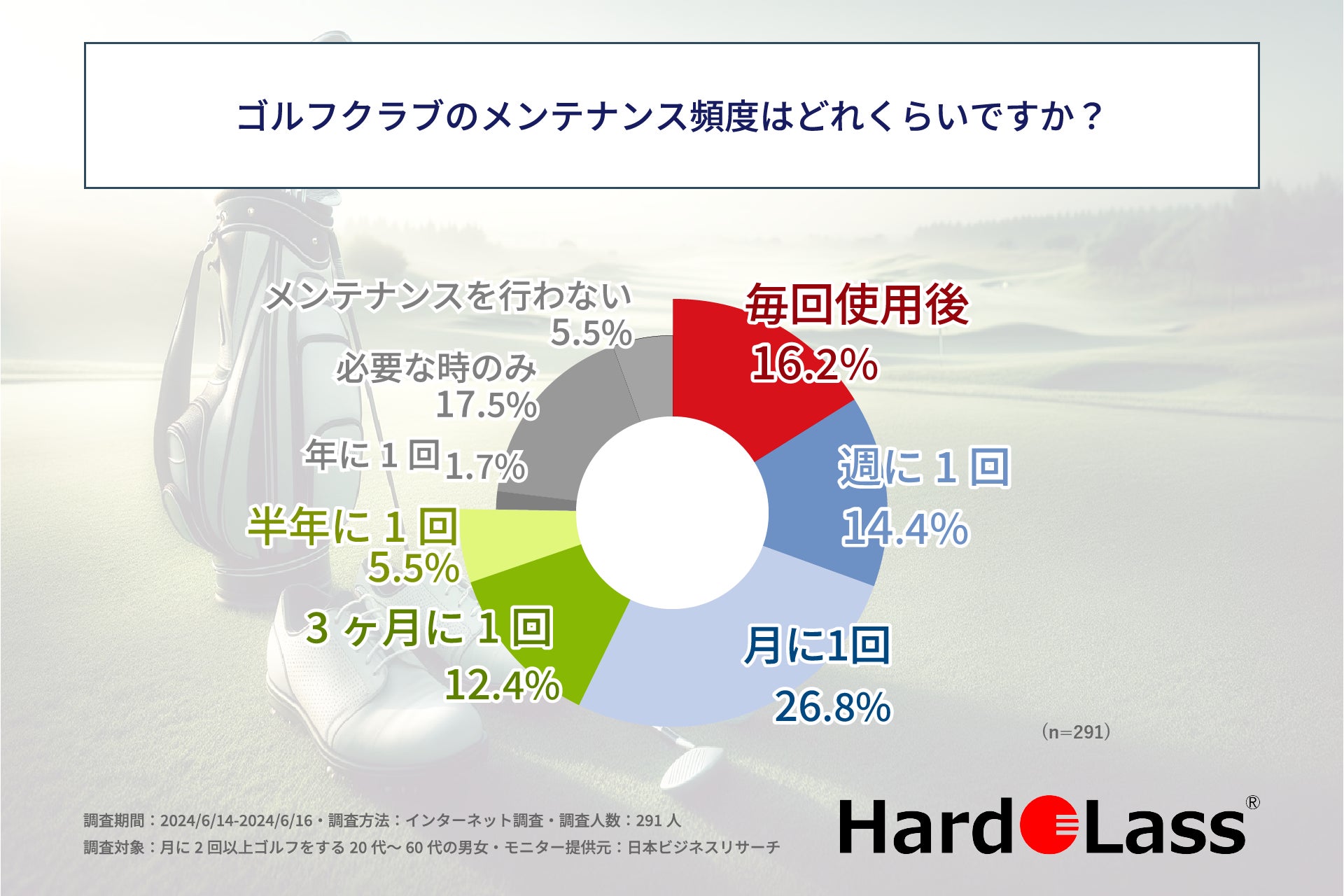 この調査結果から、ゴルフ愛好家の方はゴルフのスコアを伸ばすため、また、用品を長持ちさせるため、定期的にゴルフクラブのメンテナンスをしているという事実が明らかになりました。