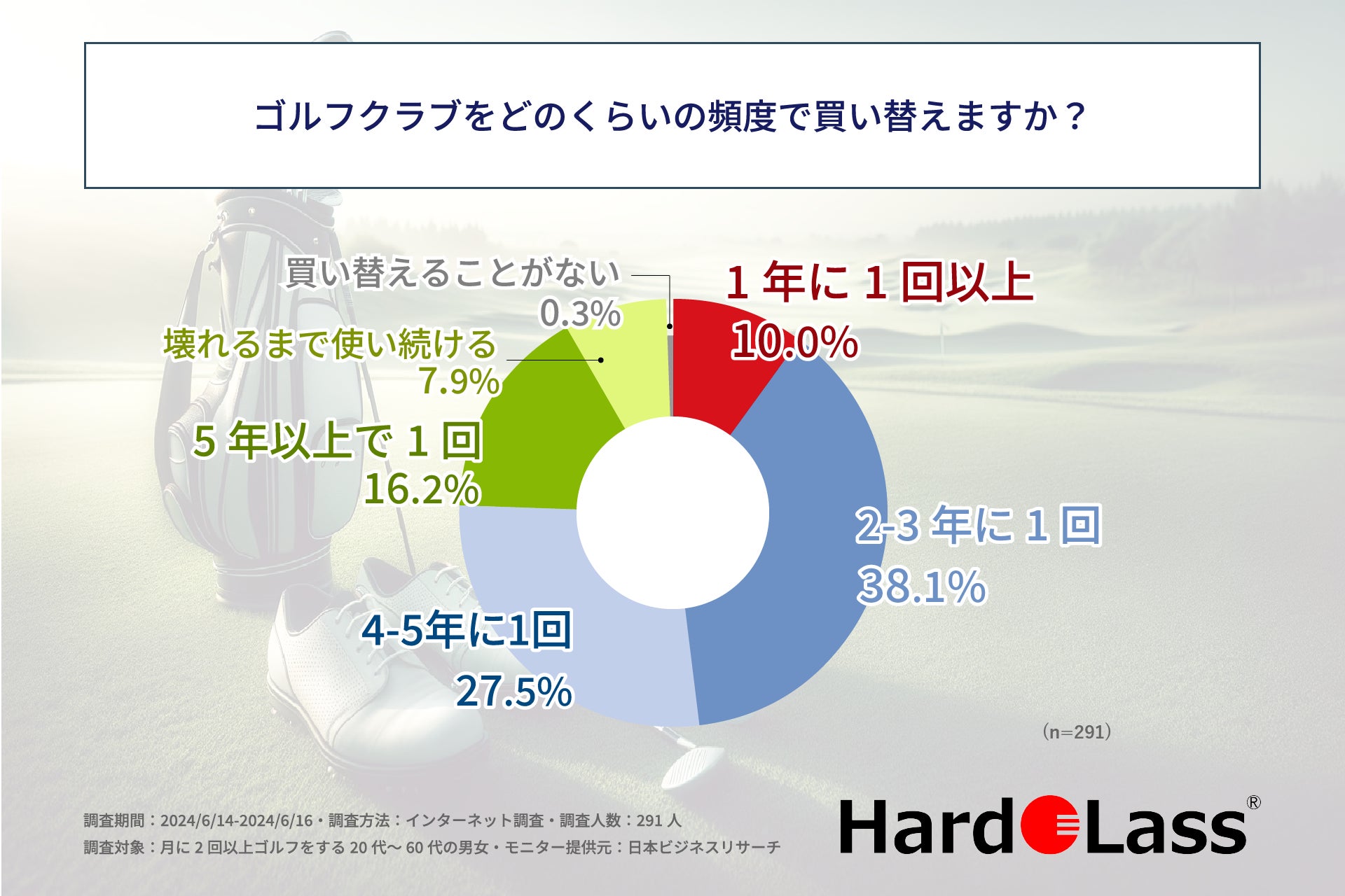 まず、「ゴルフクラブをどのくらいの頻度で買い替えるか」を尋ねる設問の回答では、1位が「2-3年に1回」で38.1%、続いて2位が「4-5年に1回」で27.5%となりました。この結果から、ゴルフ愛好家の6割以上の方が、5年に1回以上はゴルフクラブを買い替えていることが明らかになりました。
