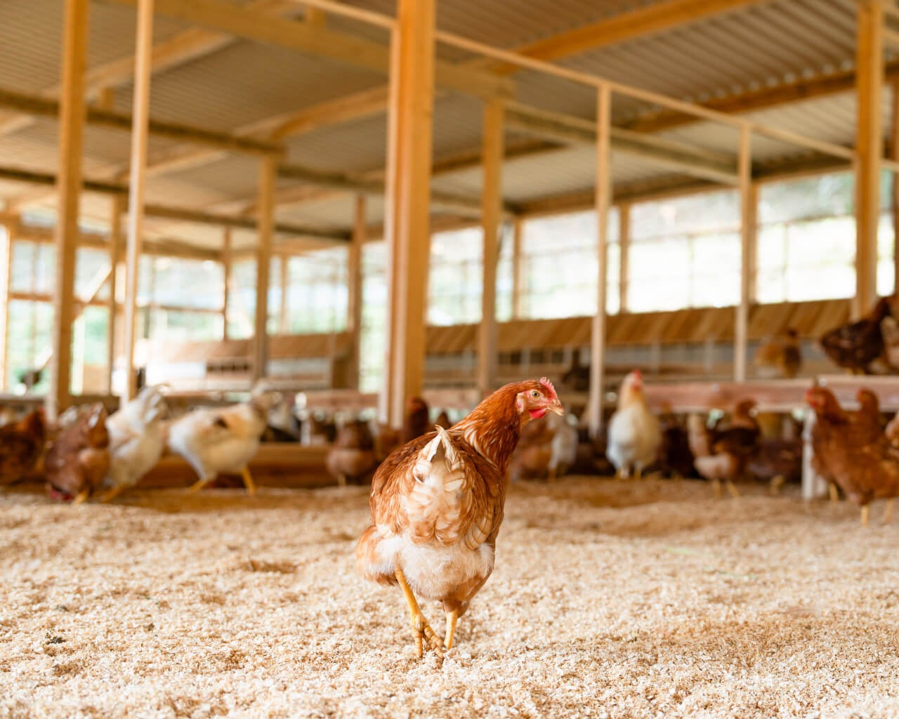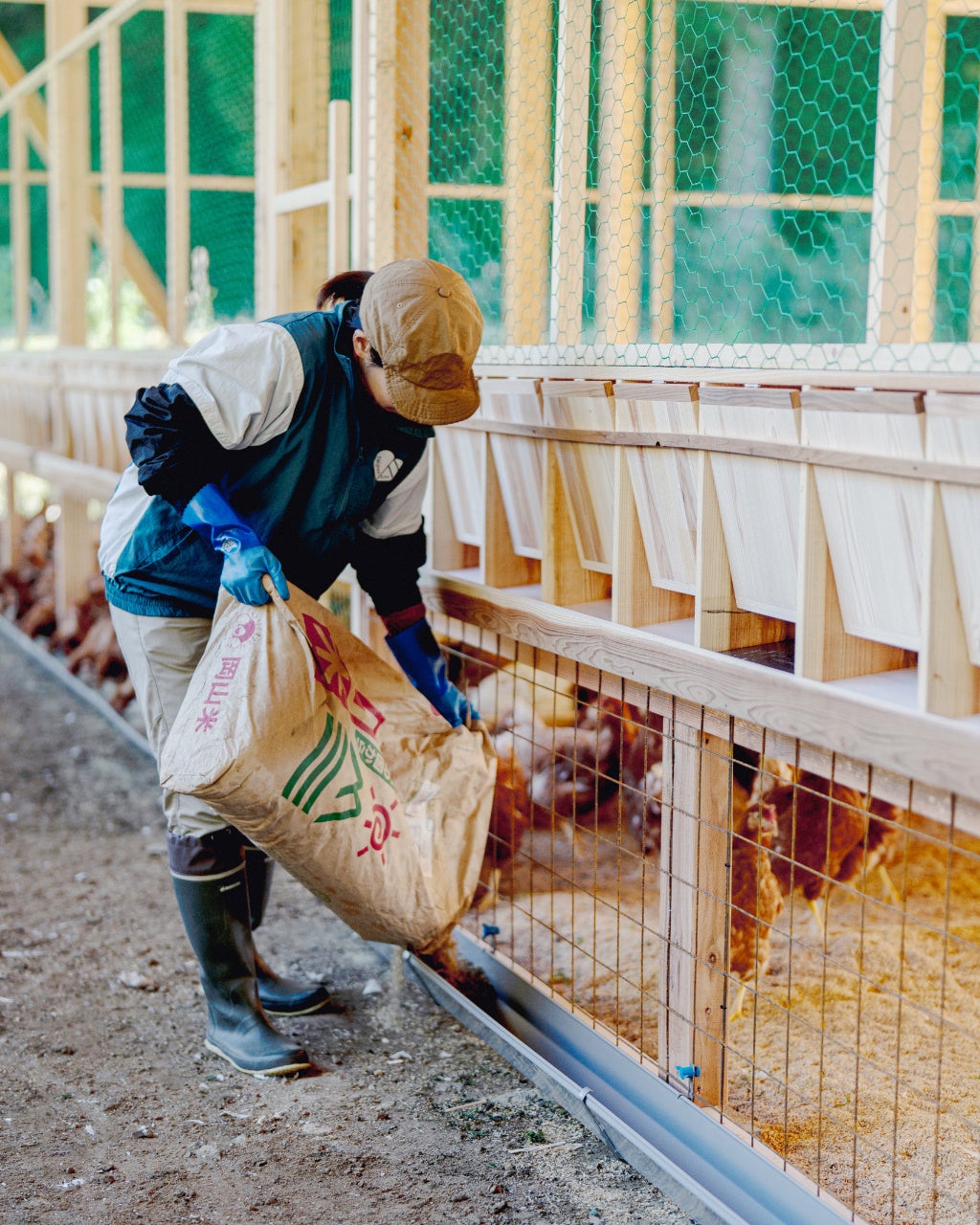 鶏舎の地面は舗装していない土です。土の上に製材工場で発生する木くずや農家から分けていただく籾殻を配合し敷料として敷き詰めています。鶏糞は土や敷料と混ざり水分が吸収され乾燥します。微生物による自然分解もおこなわれます。鶏糞は敷料と合わせて肥やしとして田畑にすき込み、米や野菜を栽培し、人や鶏の食料を生産し資源を循環させます。