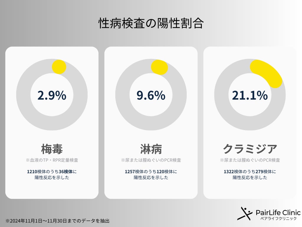 自覚症状がなくても、性感染症に感染している患者様も多く診てきました。そこで、当院は2024年11月にご来院いただいた患者様を対象に、梅毒・淋病・クラミジアの3つの性感染症の陽性率をデータ化しました。
