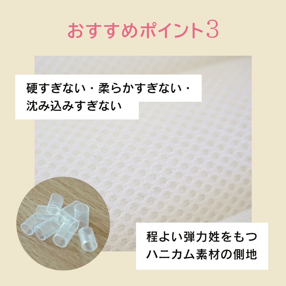 夏でも蒸れにくい。ウレタンや綿状のように熱がこもりにくい素材を使用。側地の立体ハニカムと中身のソフトパイプが通気性を確保いたします。