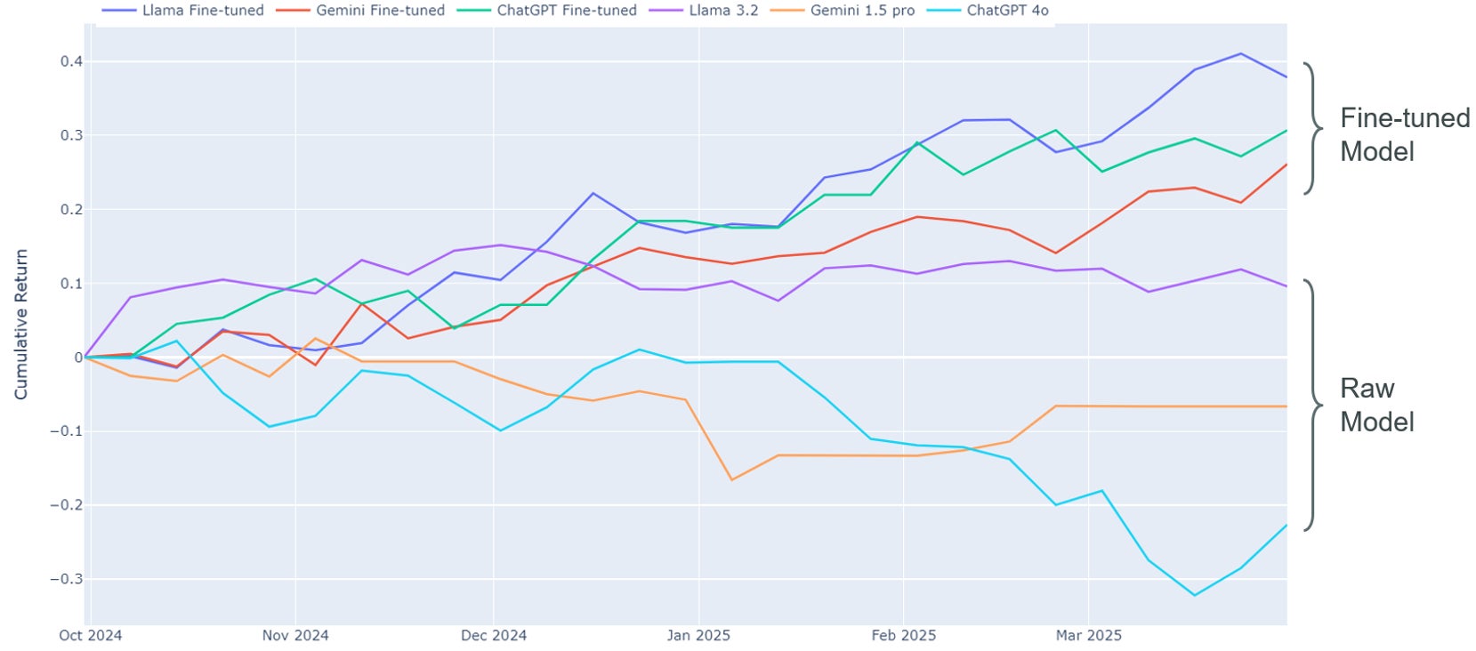 株価とニュースデータの関係を学習するファインチューニング学習の効果を検証するため、S&P500銘柄(ChatGPTはDOW30)を対象にシンプルなバックテストを実施しています。モデルは2024年9月末時点でファインチューニング可能な最新モデルを使い、それ以前のデータで学習しました。隔週の月曜朝8時(EST)時点までのデータで将来1週間の株価リターンを予測し、4%を超える銘柄をロング、-4%を下回る銘柄をショートしたところ、ファインチューニング後の3つのモデル(Fine-tuned Model)はいずれも上昇したのに対し、ファインチューニング前(Raw Model)は横ばい、または減少しました。