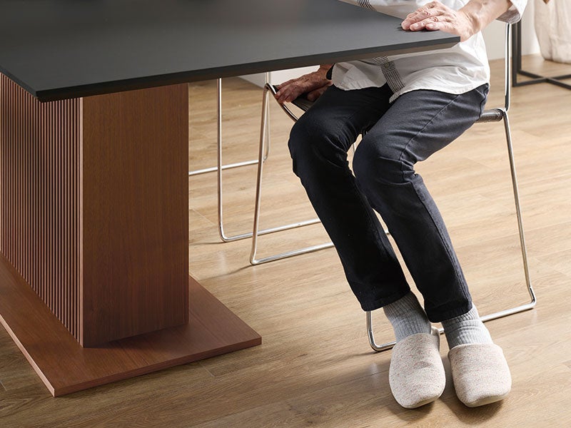 1本脚だとテーブルの四隅に脚があるものに比べて、どの方向から座っても脚が邪魔にならず、座席に座った際にも足元にゆとります。椅子もしまいやすく、大人数で座る場合にも便利です。