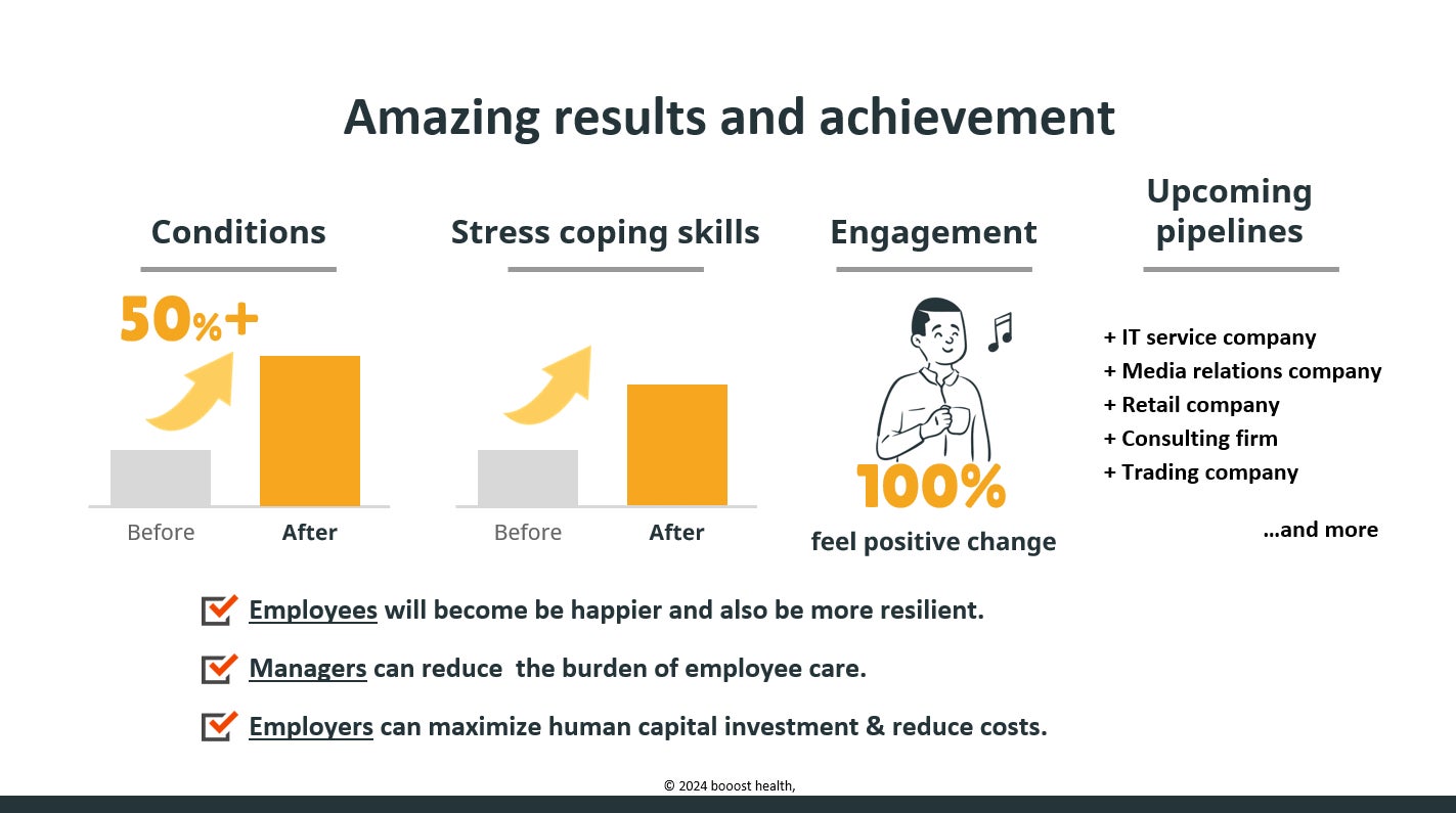 現代の企業が直面する「社員のメンタルヘルス問題」や「ストレス管理の課題」に対し、BOOOSTは、認知行動療法を基に設計されたデジタルコーチングを通じて、社員の心身の健康を強化し、組織全体のパフォーマンスを向上させます。その結果、離職やバーンアウトを防止し、生産性・レジリエンスの向上、そして健康経営への具体的対処を実現します。