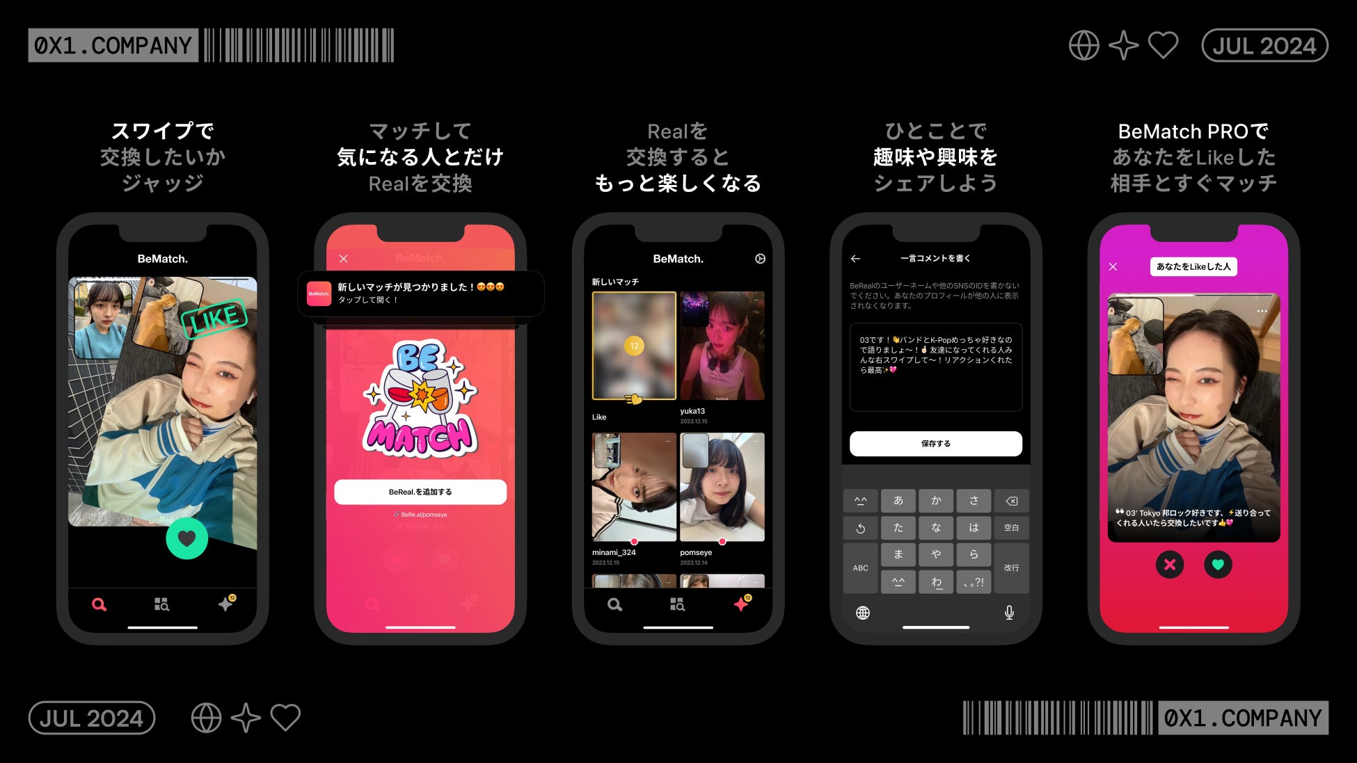 ONE株式会社はこれまでに、保有しているNFTのオリジナルグッズが購入できるサービス「Super NFT Products」、海外アプリの日本市場展開を支援する新事業「+81」などを開発、マーケットにインパクトを残してきました。2023年12月にリリースした「BeMatch.」は、「BeReal.を通じてたくさんの友だちが作れる!」というコンセプトでTikTokを中心に急速に拡大し、多くのBeReal.ユーザーの間で人気を博しています。