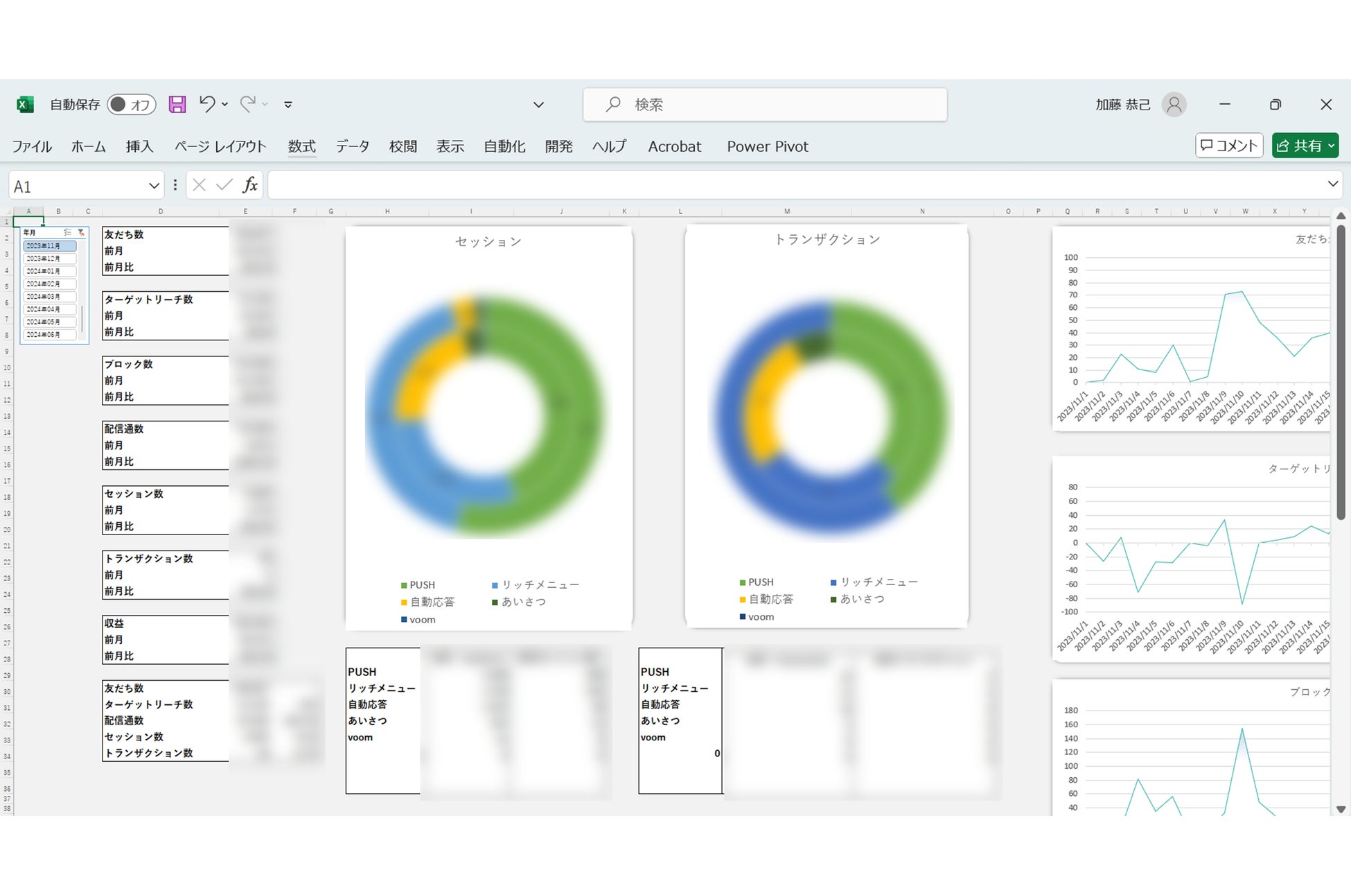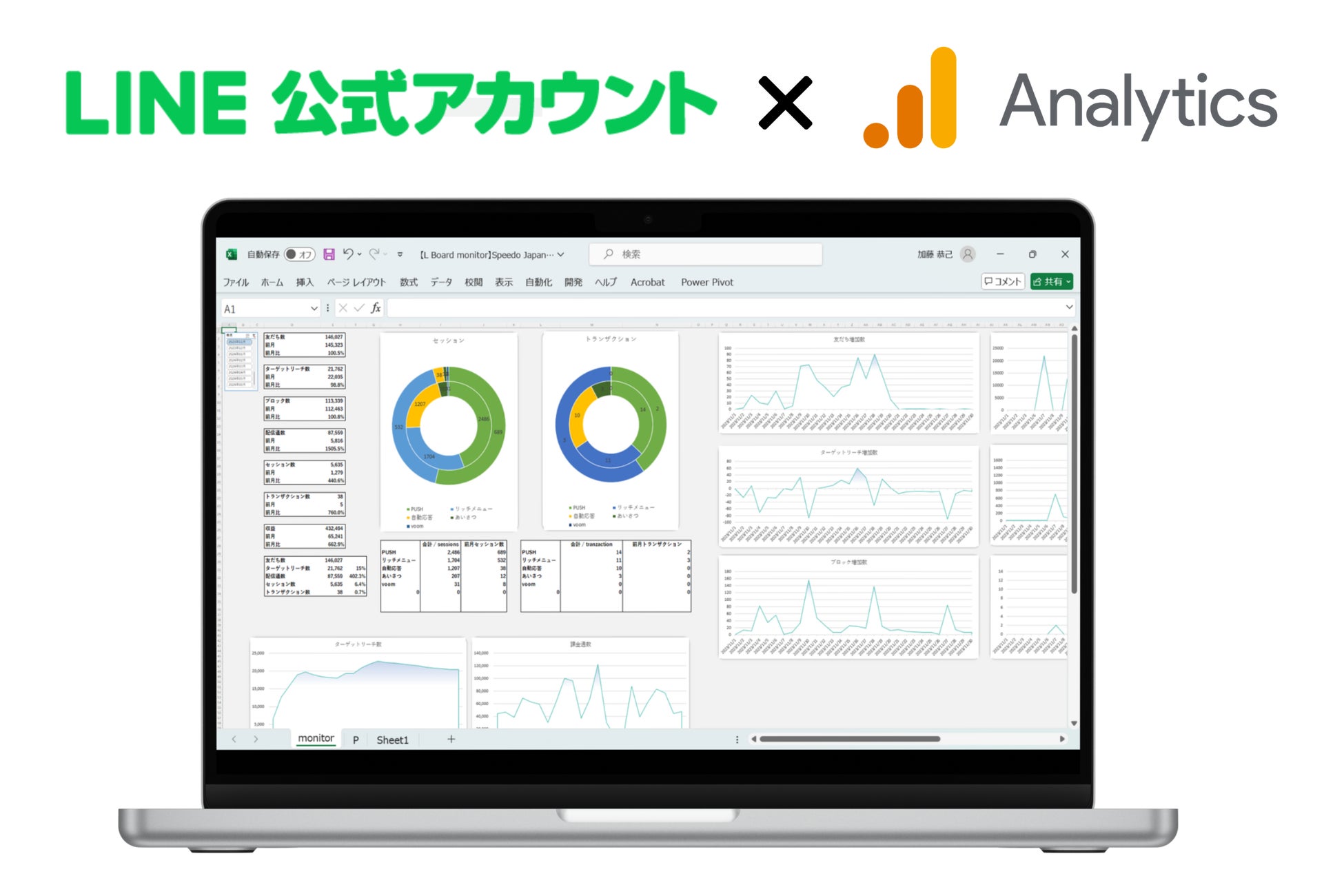 LINE経由でのセッション数、コンバージョン数、収益を前月と比較して見る事が出来る