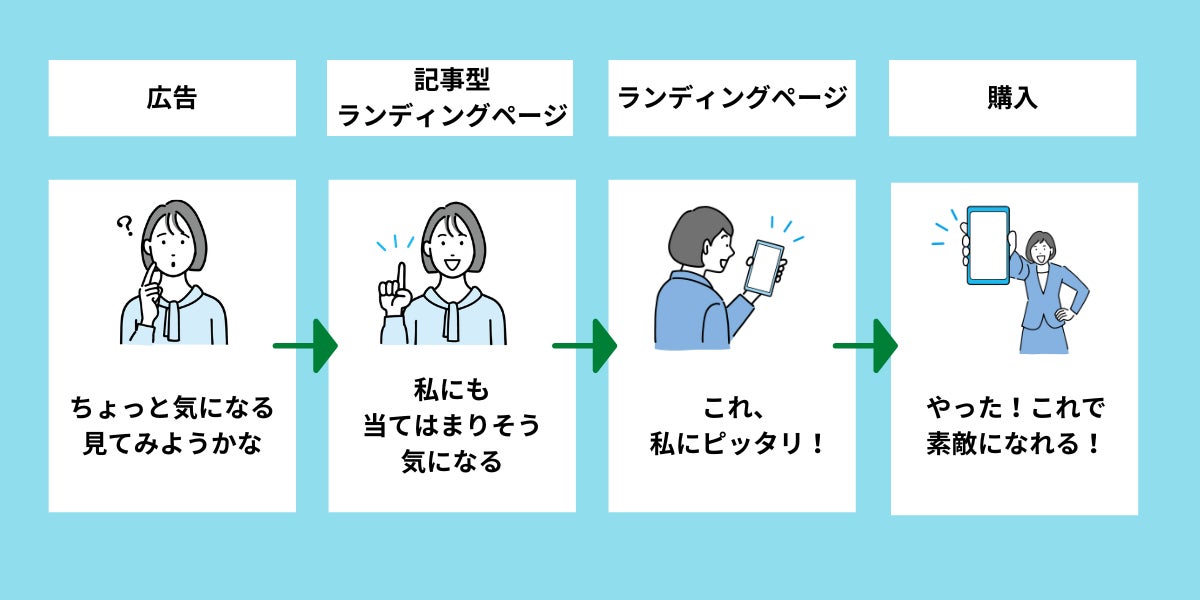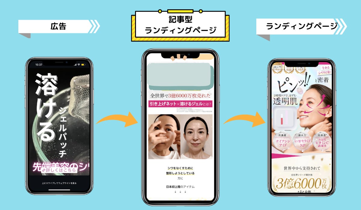 記事型ランディングページとは、広告と商品・サービスのランディングページの間に表示するクッションページのことです。