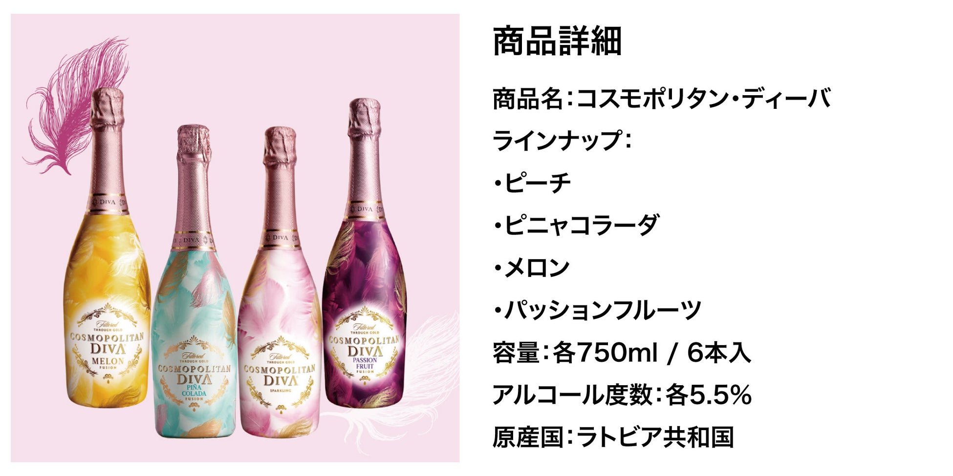 コスモポリタン ディーバは、日本ビール株式会社が日本代理店を務める世界的飲料メーカーAmber Beverage(本社:ラトビア共和国)が保有する天然果汁がベースのフルーツ フュージョン スパークリングワインであり、