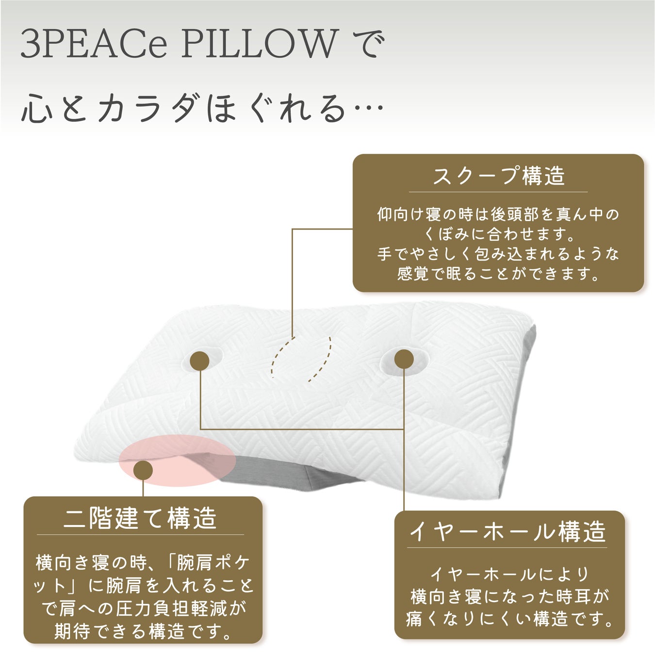 特許構造の「二階建て構造」は下層部のパイプと上層部の綿の2層構造で、横向き寝の時に圧を感じやすい、腕や肩の負担を軽減する仕様の枕。