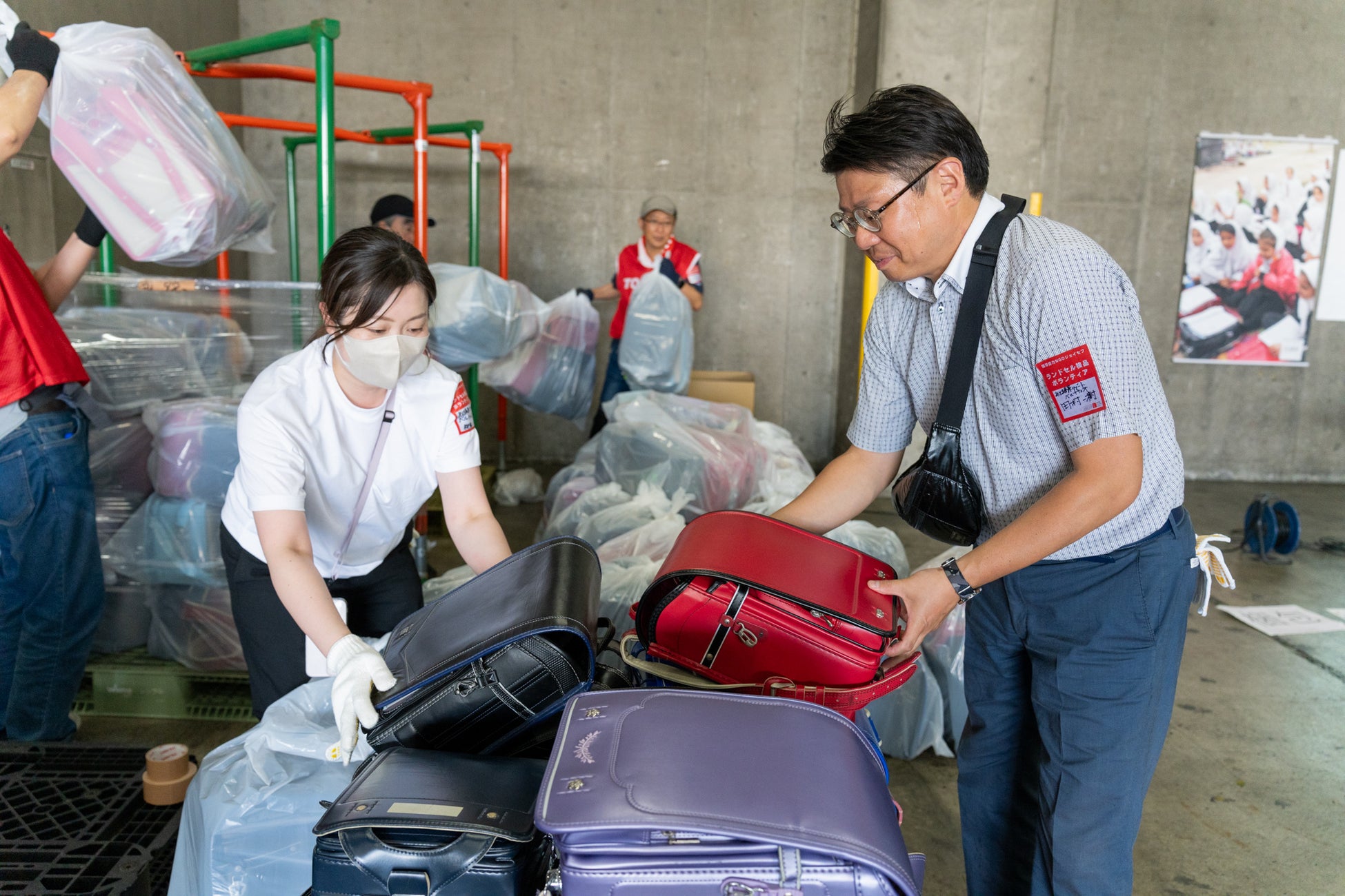集まったランドセルはボランティアの手で一つずつ開梱・検品・梱包されます。ベルナティオスタッフも参加し、皆さまのランドセルを送り出す準備をしてまいりました。