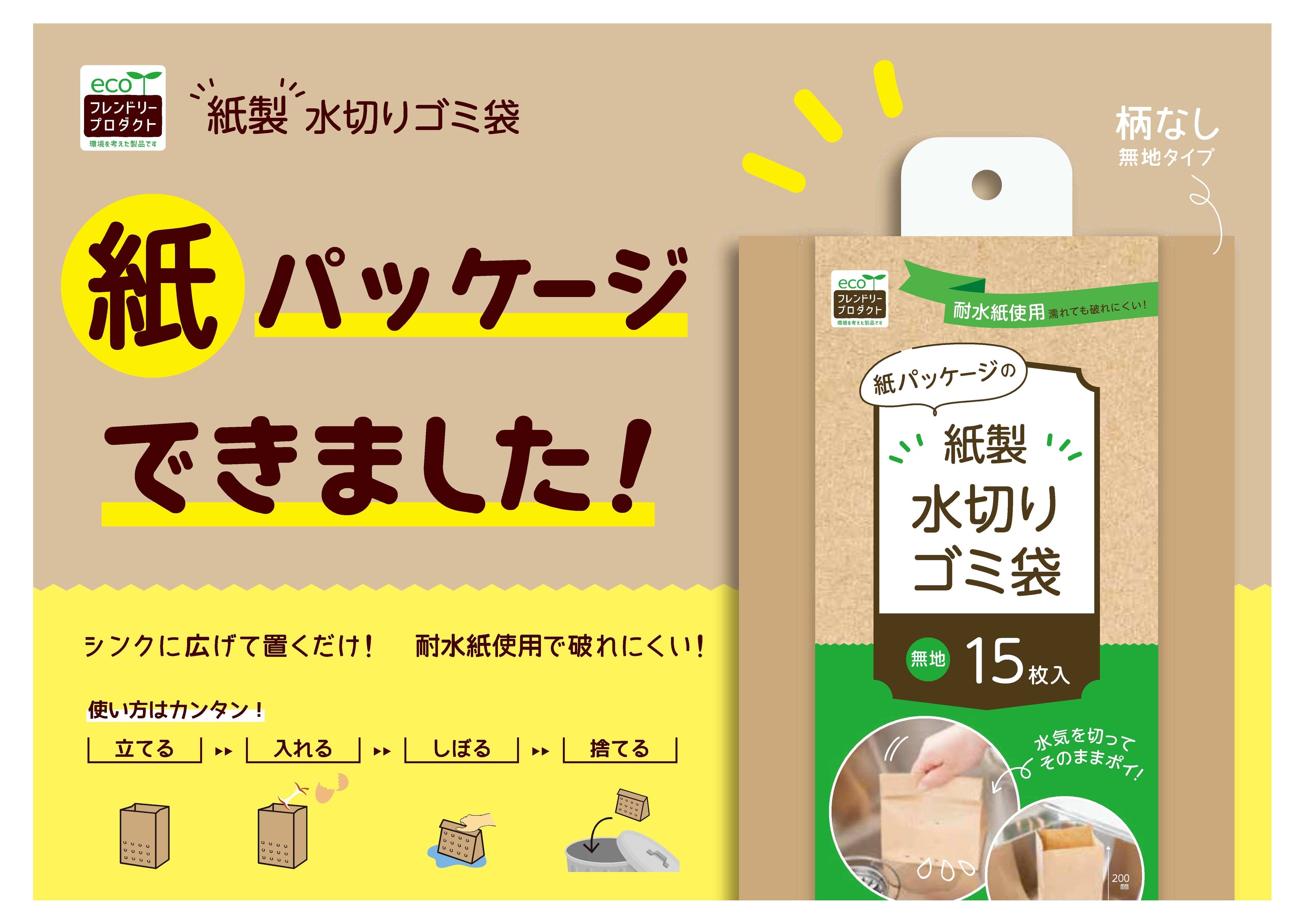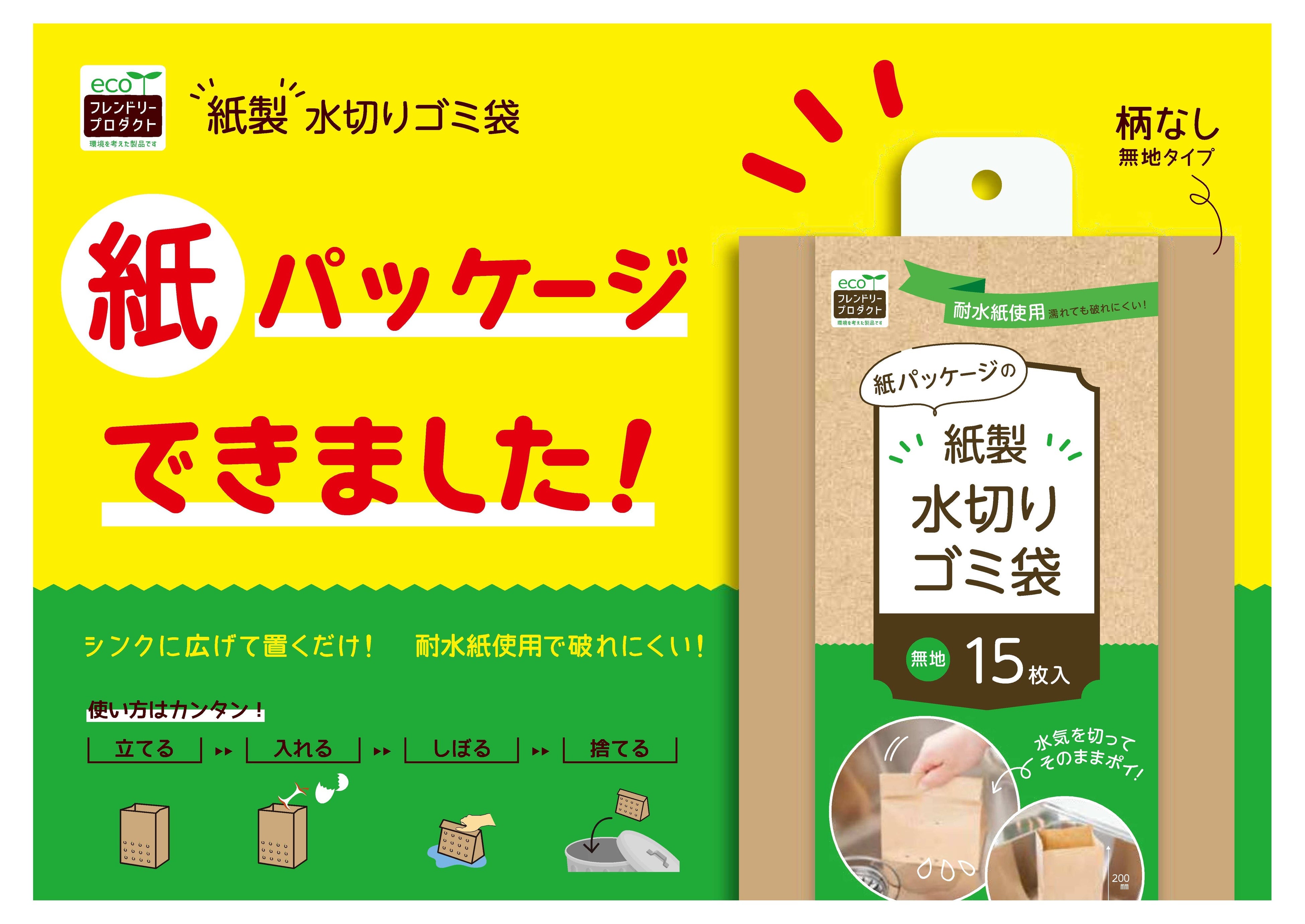 フィルムパッケージ品の「紙製水切りゴミ袋」は今年で発売15周年を迎えます。