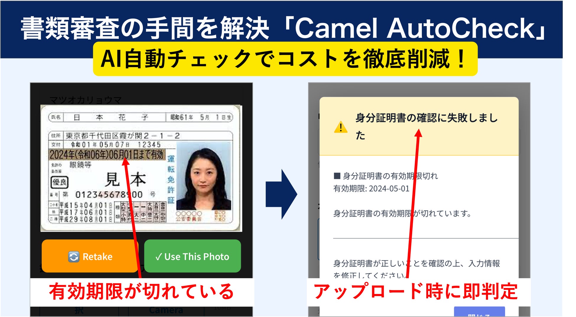 株式会社キャメルテクノロジー(本社:東京都世田谷区、代表:松岡 遼馬)は、AI-OCRによる自動審査システム「Camel AutoCheck」を2025年12月5日にリリースします。書類アップロードと同時にAIが申請内容との照合・不備検知を実施し、審査側は一致判定のみを確認。審査工数70%削減を実現します。