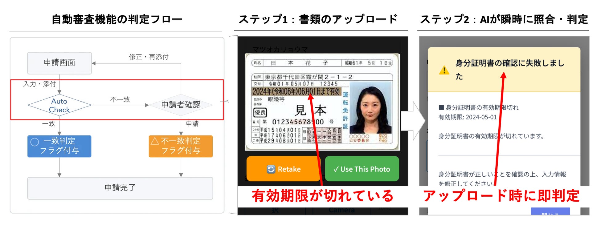 AI OCRが数秒で氏名・住所・生年月日・口座番号および申請内容等を読み取り、申請フォームの入力内容と照合。不一致があれば申請画面上に即座にアラート表示します。