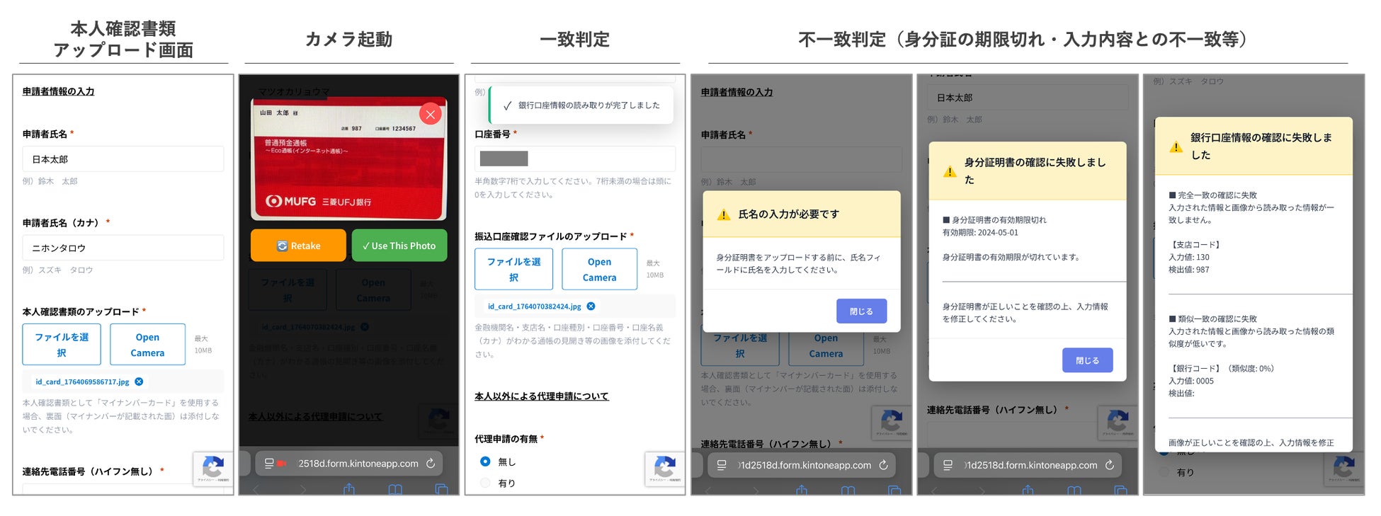 Camel AutoCheckは、フォーム上で申請書類や本人確認書類(免許証・マイナンバーカード等)、口座書類などをアップロードした瞬間に、AI OCRが文字情報を抽出し、申請内容と自動照合するシステムです。