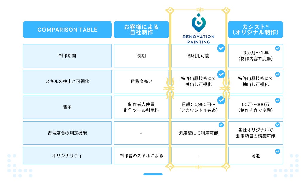 「カシスト®︎」は、業界問わず企業ごとの職人技術を抽出・可視化し、オーダーメイドの動画マニュアルを制作するサービスです。教育ツールとして活用でき、3ヶ月〜1年で20本超の動画を納品します。「カシスト®︎リフォーム塗装」は、リフォーム塗装業界に特化した短期育成支援サービスで、標準化された動画マニュアルをサブスクリプション形式で提供しています。即日導入が可能で、コストを抑えた活用ができます。独自技術の伝承には「カシスト®︎」、汎用的な育成には「カシスト®︎リフォーム塗装」と、用途に応じた使い分けが可能です。