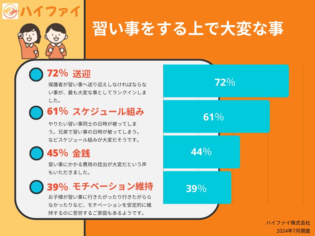 習い事をする上で保護者が大変だと感じる事は、72%が「送迎」、61%が「スケジュール組み」、45%が「金銭的に」、39%が「お子様のモチベーション維持・管理」という結果。1位ランクインの「送迎」については、お住まいの地域や好みの先生などの都合などで、車で片道1時間以上かける家庭もあるようです。遠かれ近かれ、保護者が自ら習い事に送り迎えが必要な場合、保護者の負担であることに違いはありません。2位ランクインの「スケジュール組み」については、やりたい習い事同士の曜日や時間が被ってしまったり、兄弟間で習い事の曜日や時間が被ってしまうなど、お子様の習い事のスケジュール組みに苦労される親御様は多いようです。3位ランクインの「金銭」については、上述の通り、幼児童の習い事に毎月かなりの金額をかけている家庭も多いため、金銭的な負担は気になるところのようです。4位ランクインの「お子様のモチベーション維持・管理」については、特に小さなお子様において、お子様が習い事に行きたがったり行きたがらなかったりと、モチベーションを安定的に維持するのが大変な家庭もあるようです。