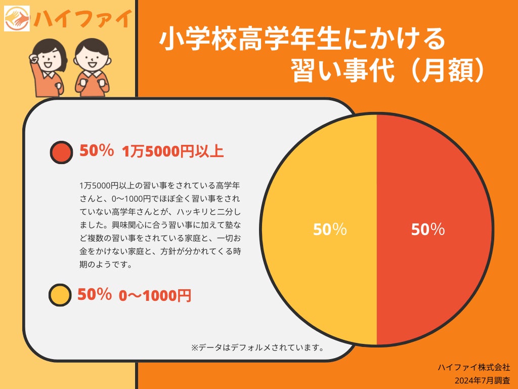 小学校高学年生にかける習い事代(月額)調査によると、50%が「1万5000円以上」、50%が「0〜1000円」という、真っ二つに分かれる結果となりました。お子様ご本人の興味関心がハッキリと出てくる時期。やりたい習い事に加えて塾など複数の習い事をされている家庭と、一切お金をかけない家庭と、家庭ごとの方針に違いが出てくるようです。