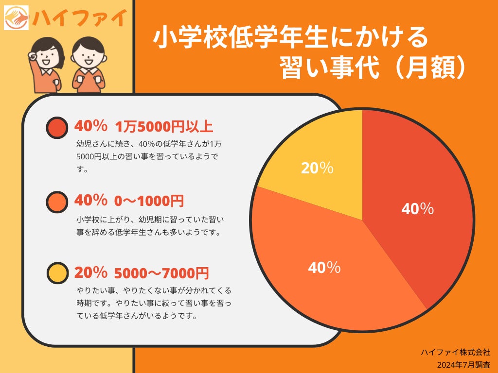 小学校低学年生にかける習い事代(月額)調査によると、40%が「1万5000円以上」、40%が「0〜1000円」、20%が「5000〜7000円」という結果。幼児に引き続き、「1万5000円以上」のお金をかける小学校低学年生が40%いるのに対し、同じく40%が「0〜1000円」と全くお金をかけないようです。幼児期に習っていた習い事を小学校に上がって辞める子もいるようです。20%の小学校低学年生は、やりたい事だけに絞って習い事をしているようです。