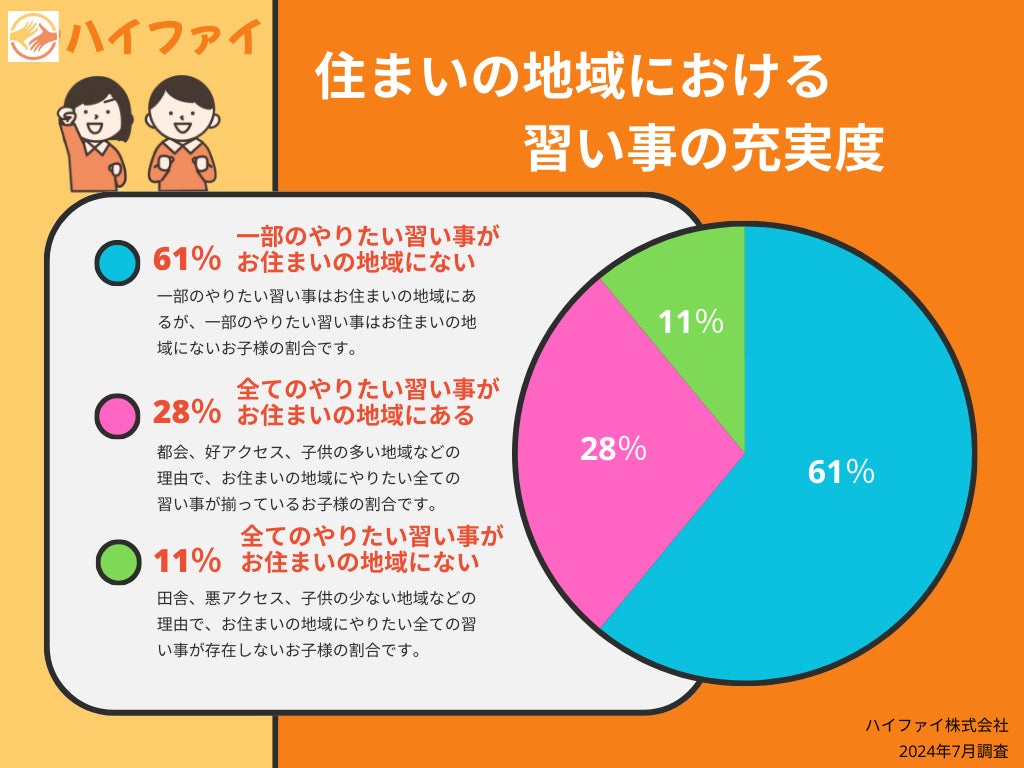 お住まいの地域における習い事の充実度について、61%が「一部のやりたい習い事が住まいの地域にない」、28%が「全てのやりたい習い事が住まいの地域にある」、11%が「全てのやりたい習い事が住まいの地域にない」と回答。61%の「一部のやりたい習い事が住まいの地域にない」とは、具体例としては一部のやりたい習い事は住まいの地域にあり既に習っているが、別の一部のやりたい習い事は住まいの地域にないためやりたい事がやれていないというようなケースが該当。28%の「全てのやりたい習い事が住まいの地域にある」とは、都会・好立地・地域に子供が多いなどの理由で、お住まいの地域にやりたい習い事が全て揃っているお子様の割合です。11%の「全てのやりたい習い事が住まいの地域にない」とは、田舎・悪アクセス・地域に子供が少ないなどの理由で、お住まいの地域にやりたい習い事が全て存在しないお子様の割合です。