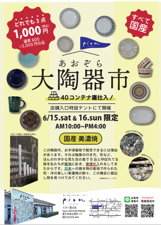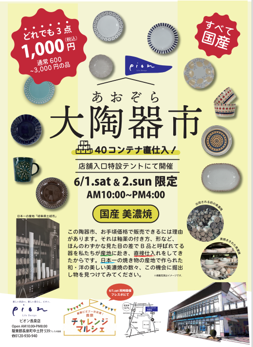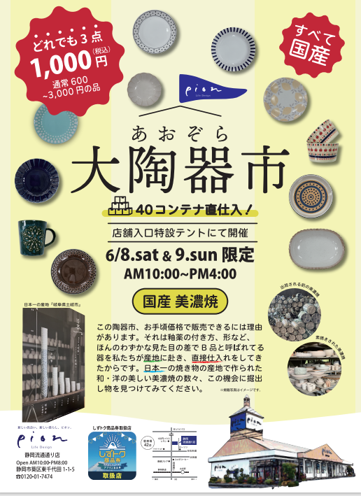美濃焼がどれでも3点で税込1,000円の驚きの特別価格!「あおぞら大陶器市」をピオン4店舗にて開催・5月25日~清水店よりスタート
